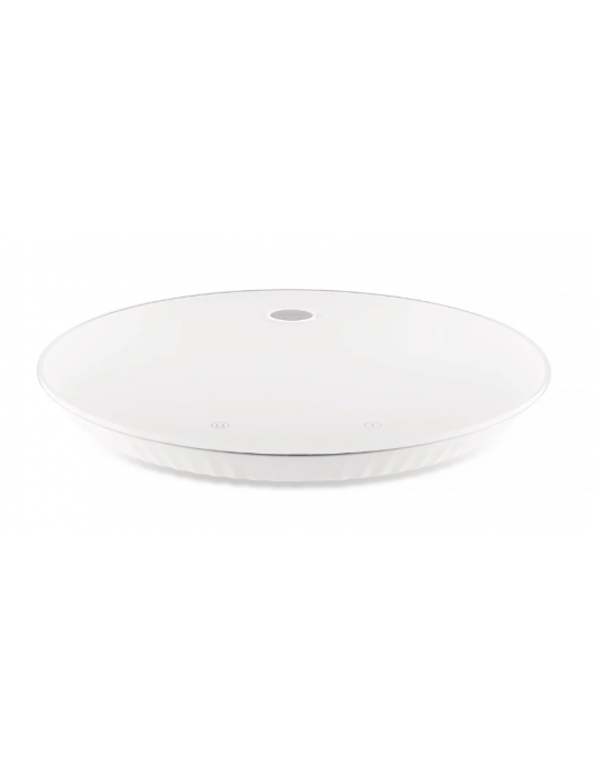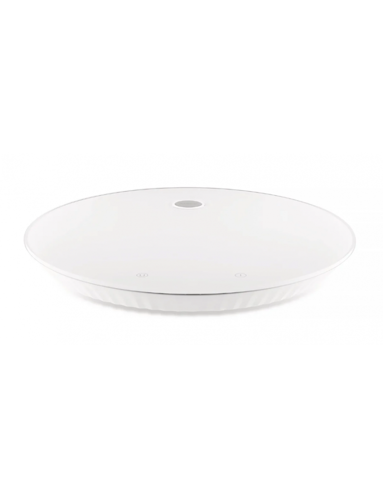 Le linee precise ed eleganti del decoro impreziosiscono un oggetto dalle alte prestazioni funzionali. Un innovativo sistema consente di riporre la bilancia appesa al muro, trasformandola in elemento decorativo.