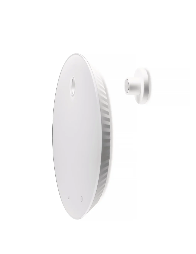 Le linee precise ed eleganti del decoro impreziosiscono un oggetto dalle alte prestazioni funzionali. Un innovativo sistema consente di riporre la bilancia appesa al muro, trasformandola in elemento decorativo.