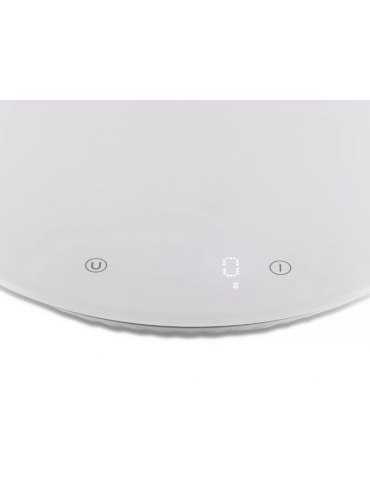 Le linee precise ed eleganti del decoro impreziosiscono un oggetto dalle alte prestazioni funzionali. Un innovativo sistema consente di riporre la bilancia appesa al muro, trasformandola in elemento decorativo.