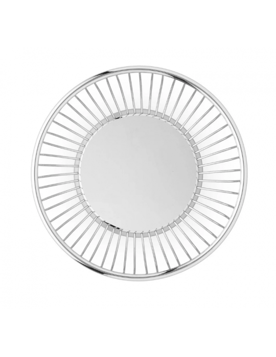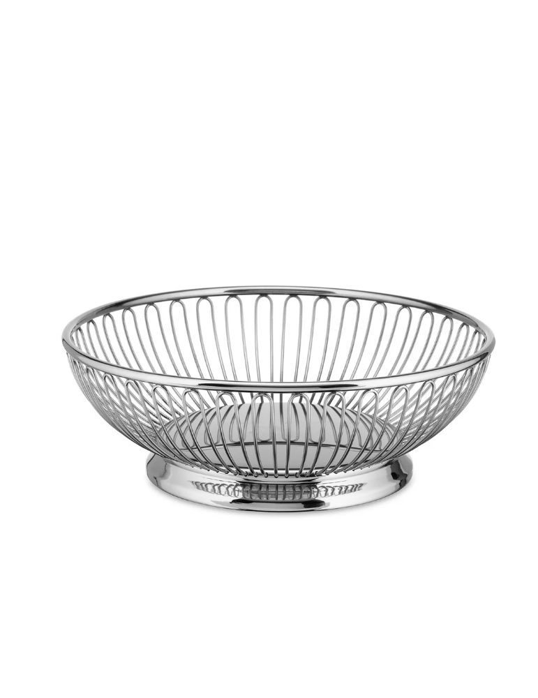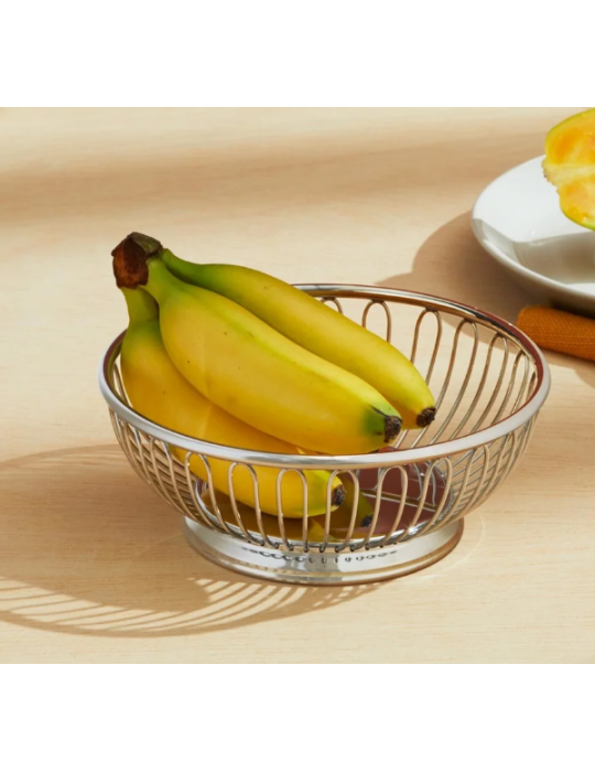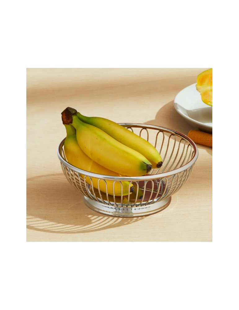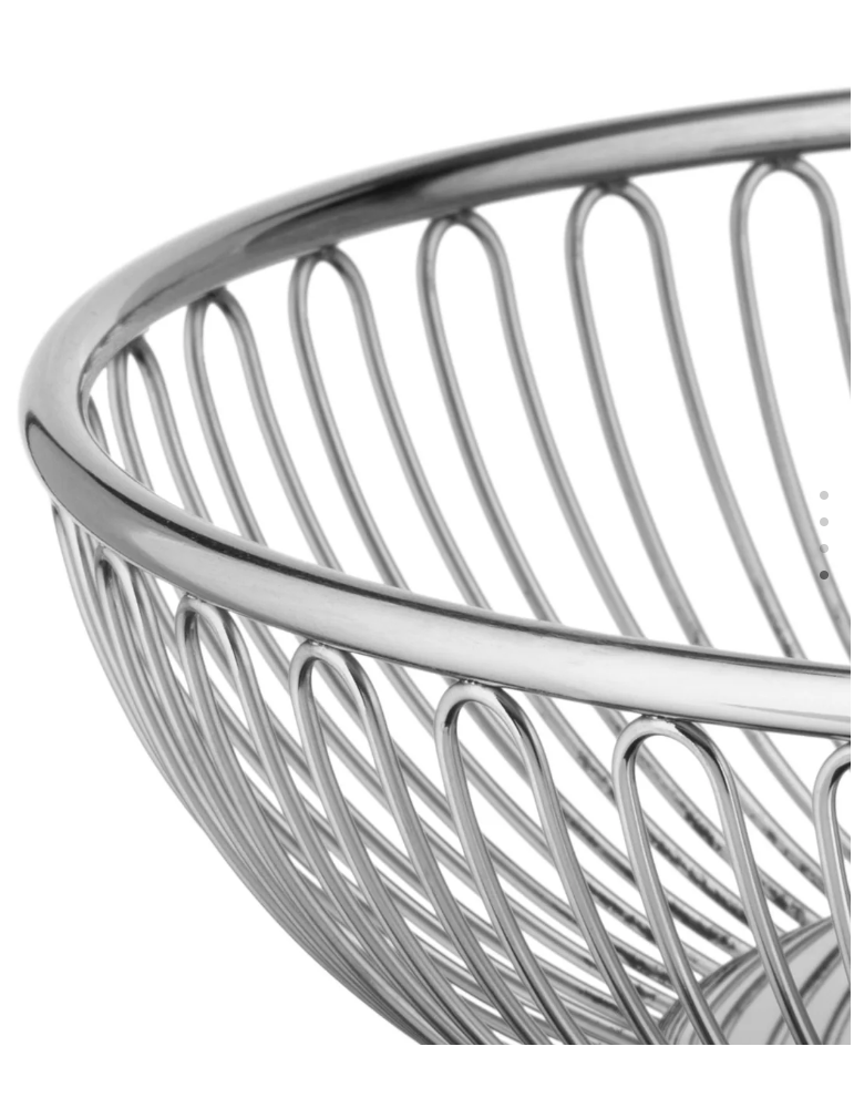 Realizzato in acciaio inossidabile con lavorazione a filo, si inserisce in una variante tipologica presente da secoli nella storia del casalingo: quella dei cestini a filo in metallo.