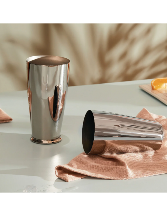Una rivisitazione del classico shaker americano, indispensabile tra gli oggetti del servizio da bar: composto da due bicchieri d'acciaio e regala sicurezza al movimento scattante e veloce dei mixologist, anche dei meno esperti.