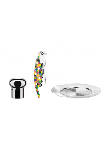 L'iconico cavatappi Parrot - Proust disegnato da Alessandro Mendini si unisce al minimale tappo per vino Noè e all'espressivo quanto raffinato design del sottobottiglia Stiges.