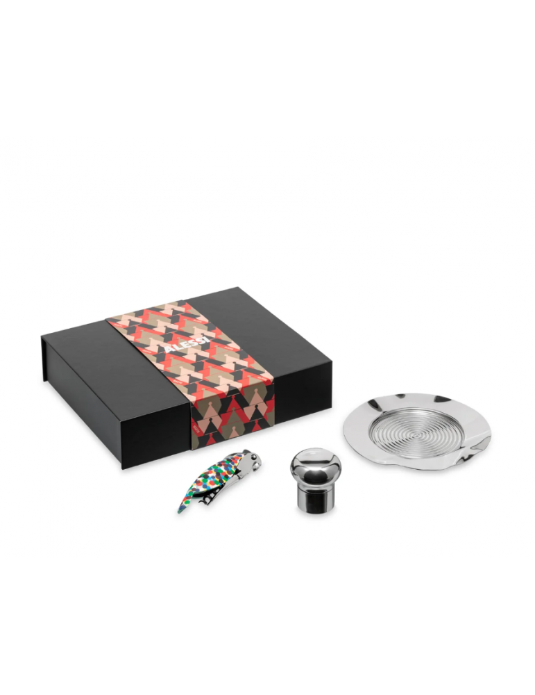 Forte di una specializzazione ormai centenaria nell'ambito degli oggetti per il servizio del vino, Alessi propone un set che sintetizza gli strumenti indispensabili nella casa di ogni estimatore di vini.