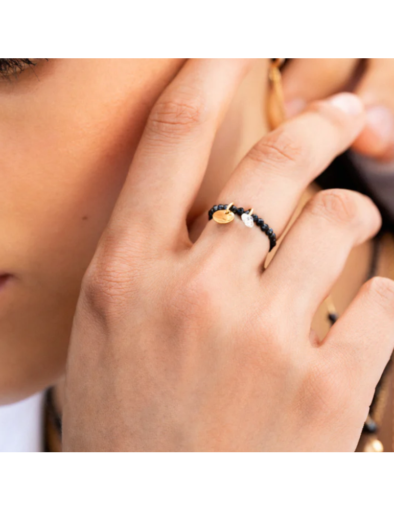 Dalla collezione Gipsy Chic, un anello elastico dallo spirito libero e raffinato. Realizzato in argento 925, è decorato con scintillanti zirconi milky che donano luce e delicatezza. I due ciondoli pendenti – una medaglietta dorata e uno zircone nudo – aggiungono un tocco giocoso e originale. Perfetto da indossare da solo o mixato con altri anelli Rue des Mille per un effetto boho contemporaneo.