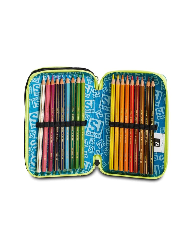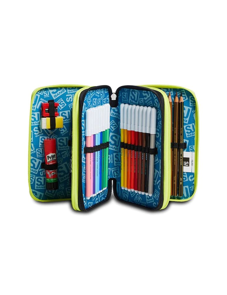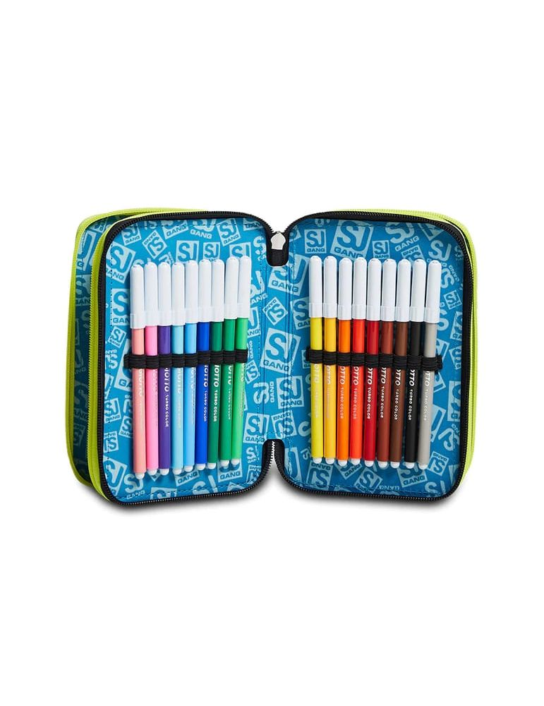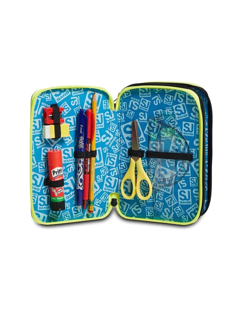 Ciao! Sono il coloratissimo Astuccio 3 zip SJ Gang. Dotato di 3 scomparti completi di tutto il materiale necessario per fare al meglio i tuoi lavori di scuola, abbinami a uno zaino o a un trolley SJ Gang.