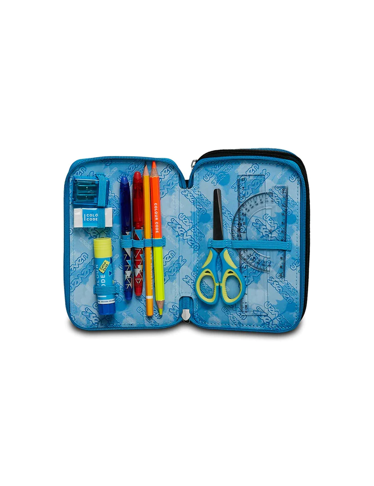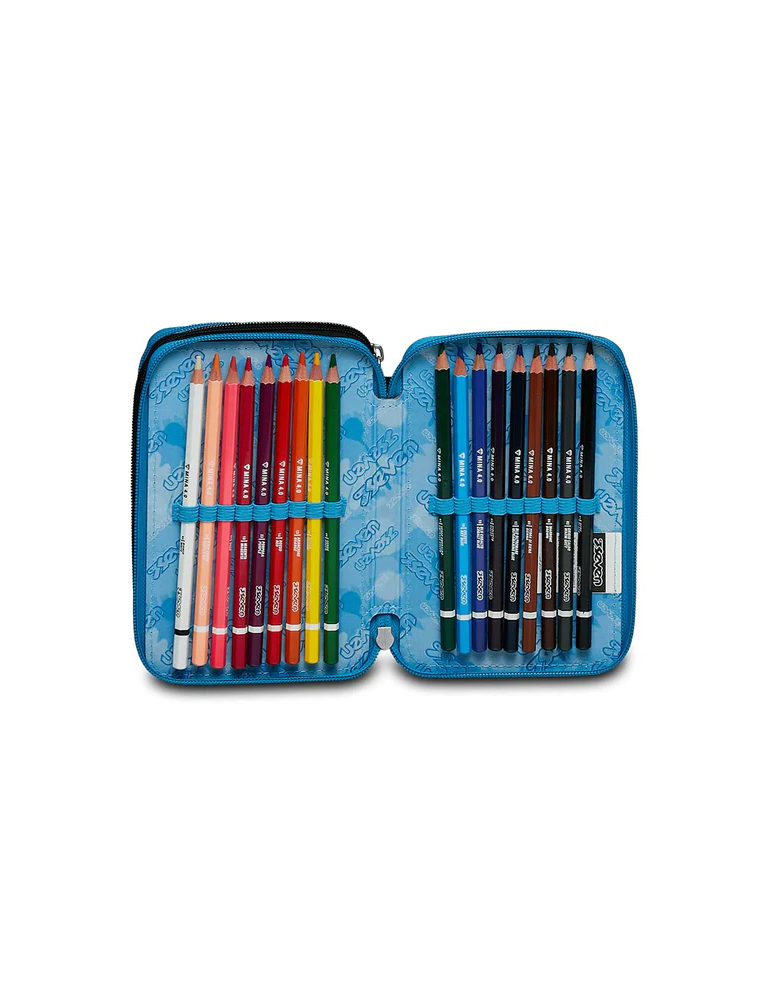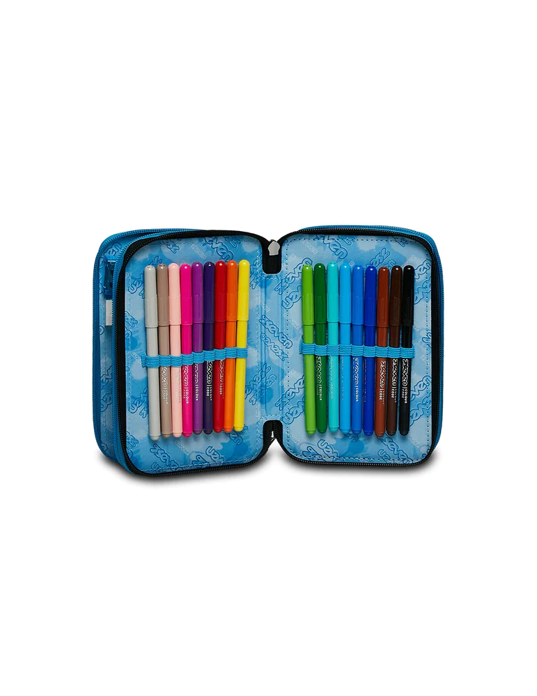 Ciao! Sono il coloratissimo Astuccio 3 zip SJ Gang. Dotato di 3 scomparti completi di tutto il materiale necessario per fare al meglio i tuoi lavori di scuola, abbinami a uno zaino o a un trolley SJ Gang.