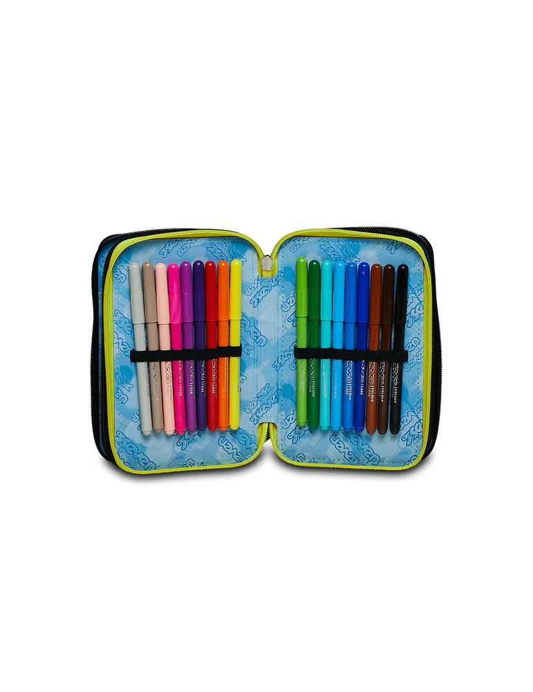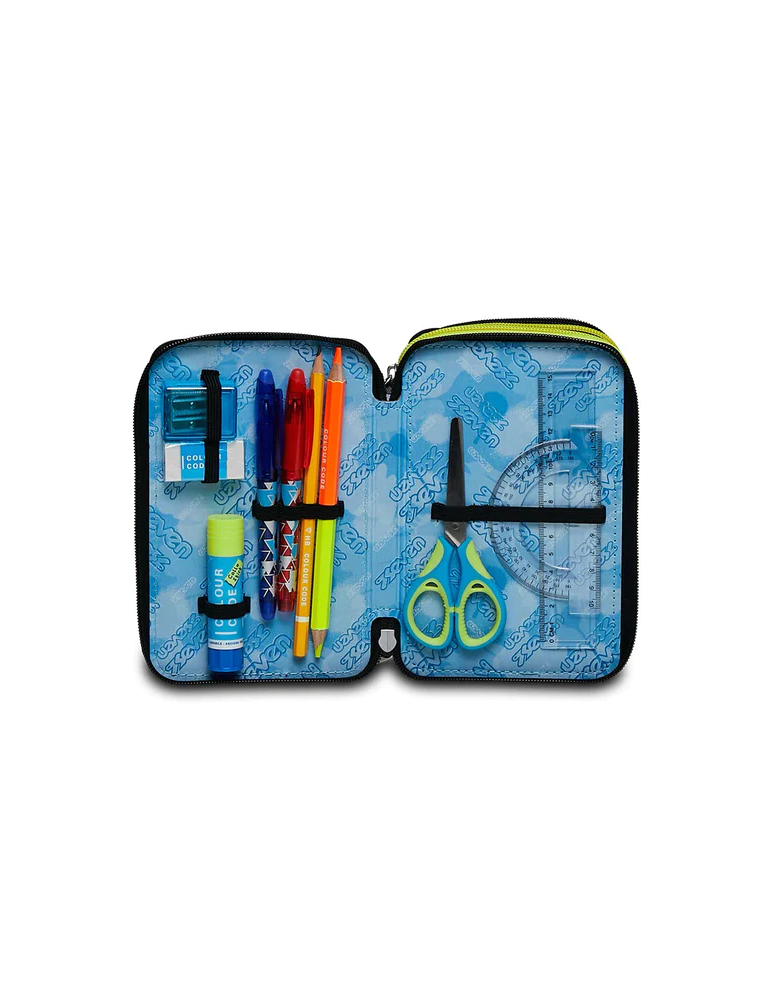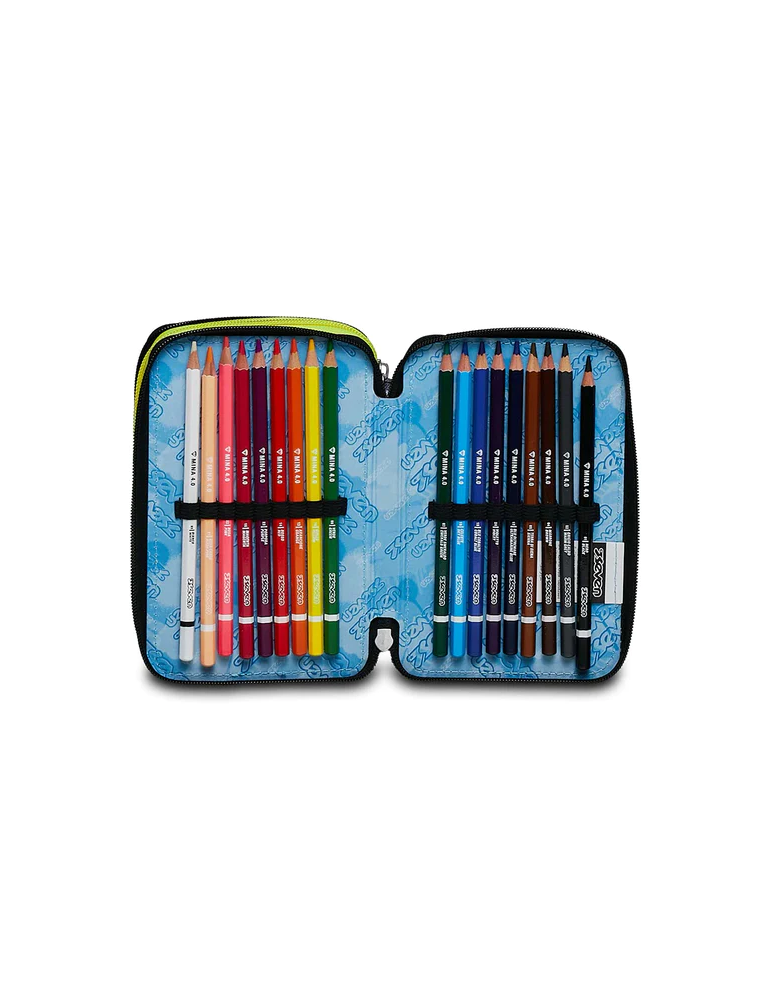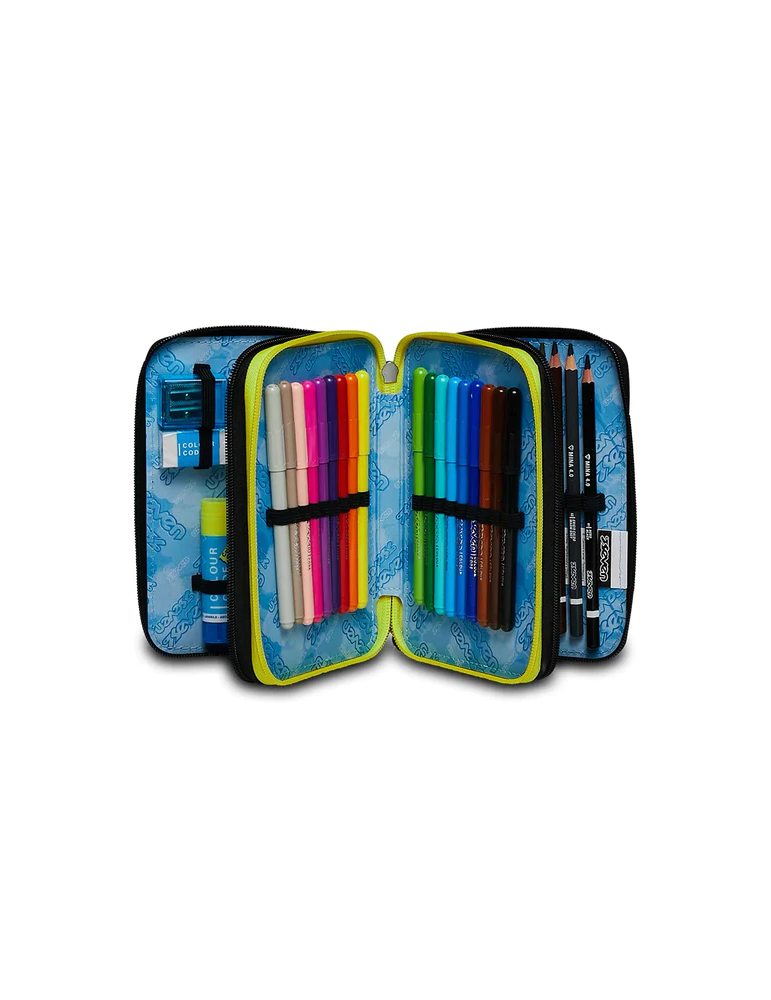 Ciao! Sono il coloratissimo Astuccio 3 zip SJ Gang. Dotato di 3 scomparti completi di tutto il materiale necessario per fare al meglio i tuoi lavori di scuola, abbinami a uno zaino o a un trolley SJ Gang.