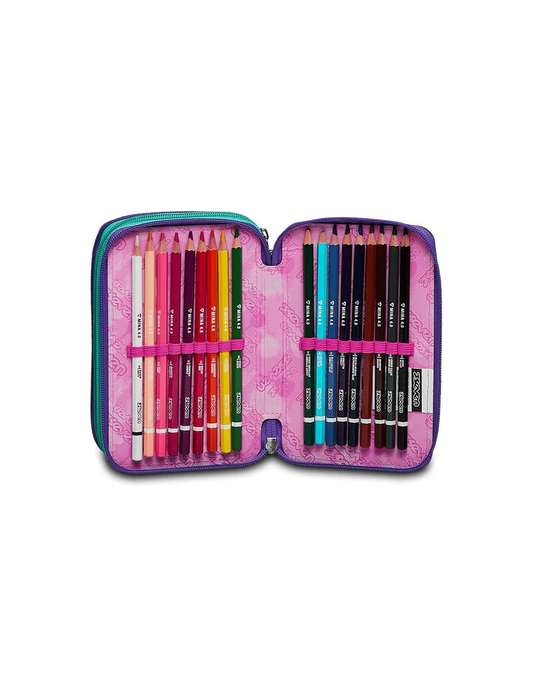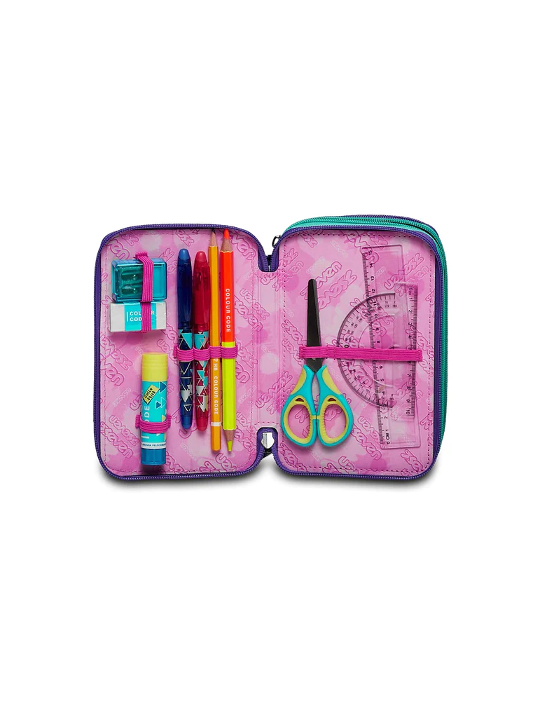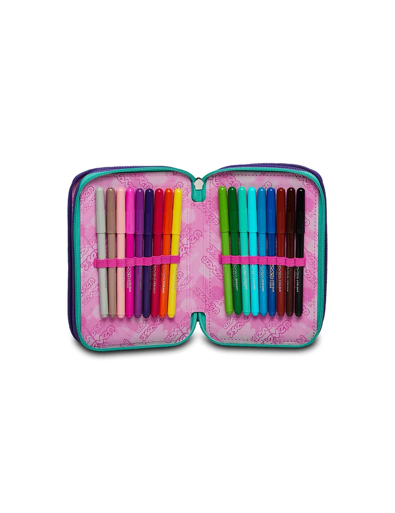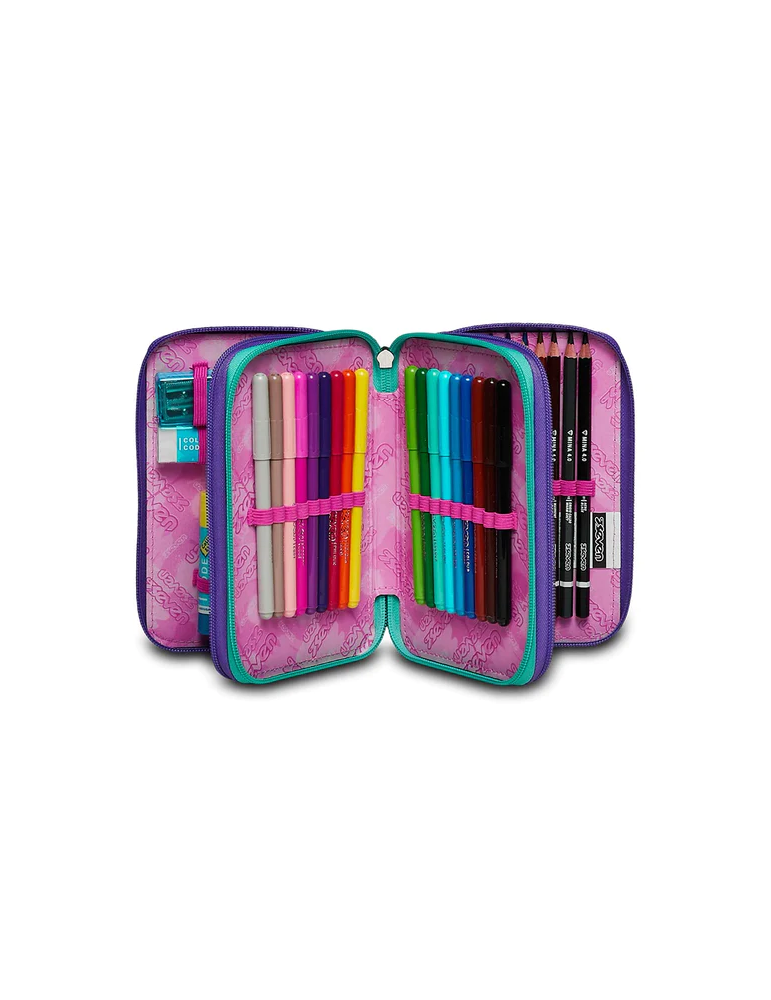 Ciao! Sono il coloratissimo Astuccio 3 zip SJ Gang. Dotato di 3 scomparti completi di tutto il materiale necessario per fare al meglio i tuoi lavori di scuola, abbinami a uno zaino o a un trolley SJ Gang.