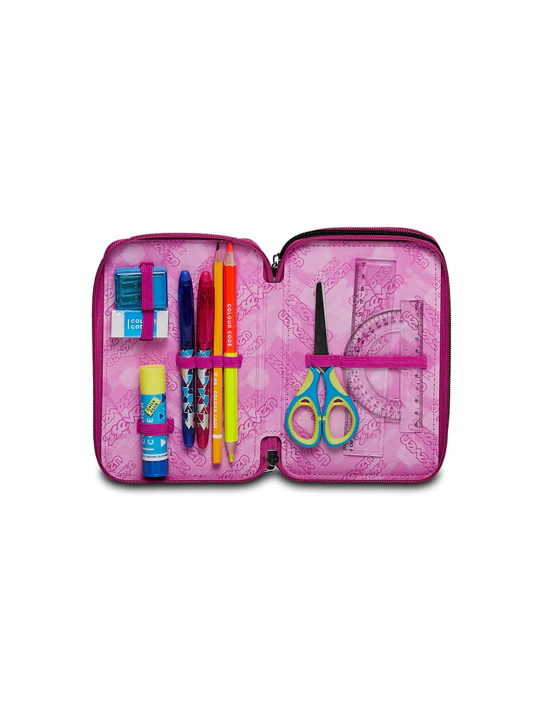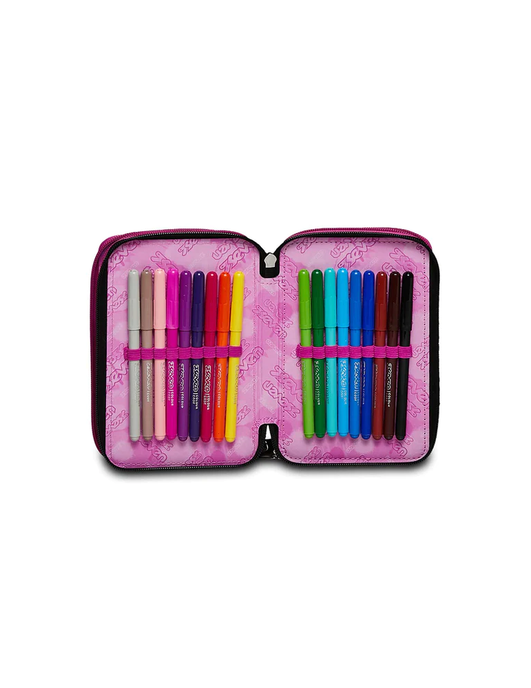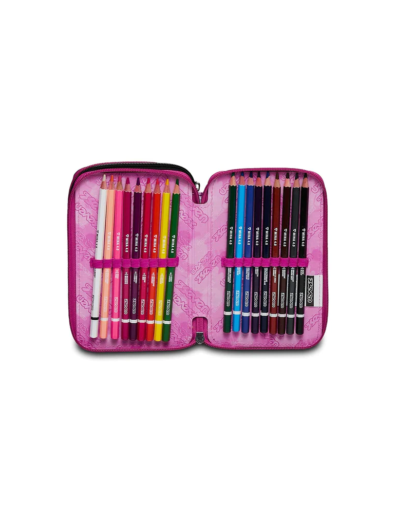 Ciao! Sono il coloratissimo Astuccio 3 zip SJ Gang. Dotato di 3 scomparti completi di tutto il materiale necessario per fare al meglio i tuoi lavori di scuola, abbinami a uno zaino o a un trolley SJ Gang.