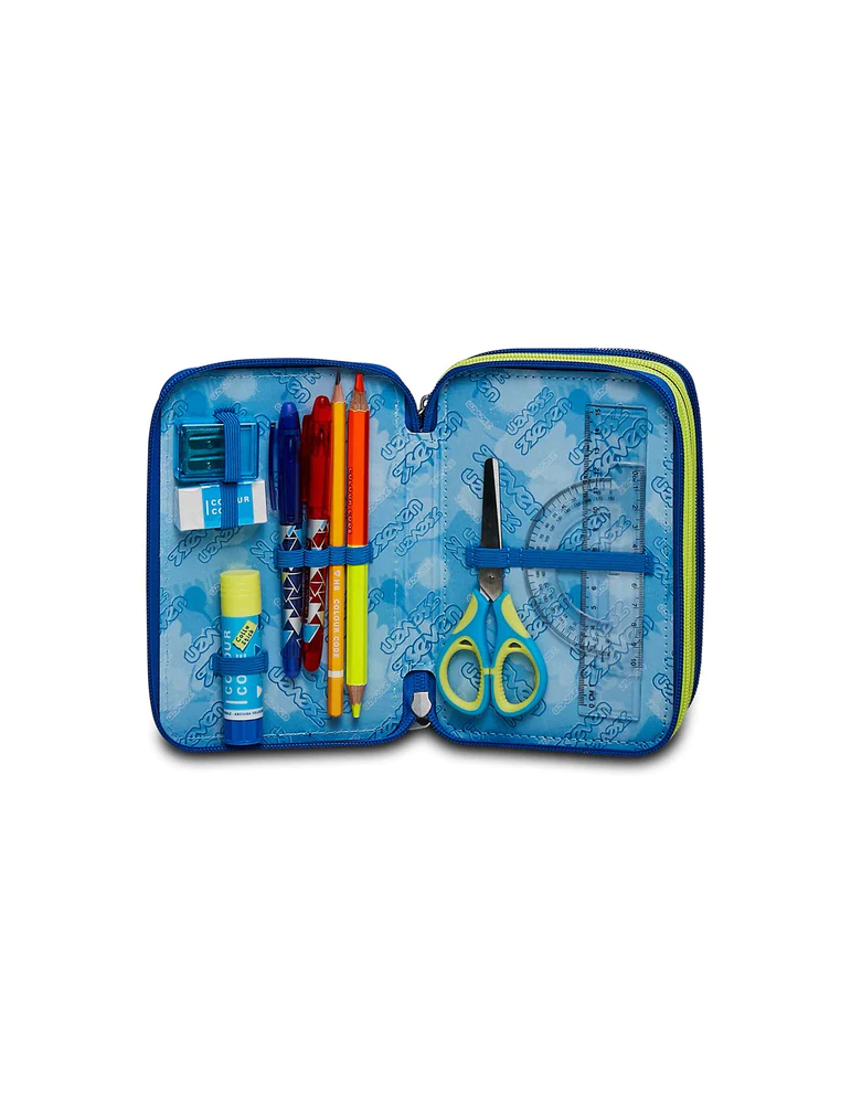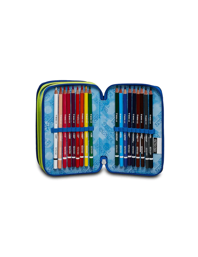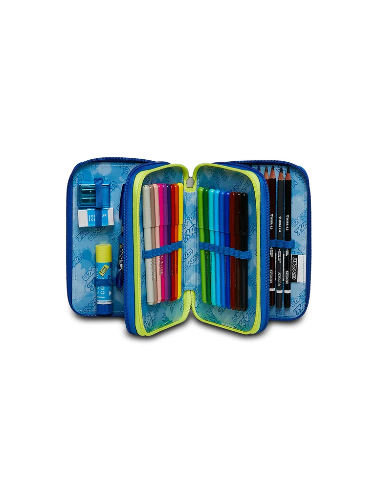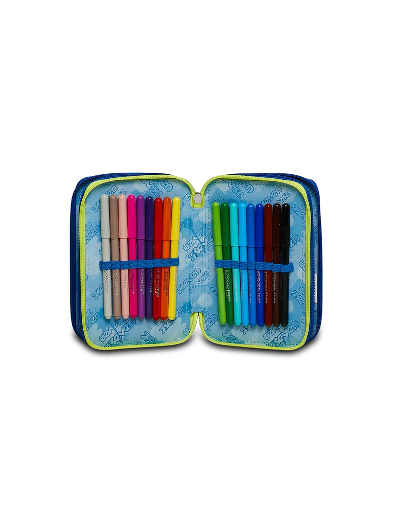 Ciao! Sono il coloratissimo Astuccio 3 zip SJ Gang. Dotato di 3 scomparti completi di tutto il materiale necessario per fare al meglio i tuoi lavori di scuola, abbinami a uno zaino o a un trolley SJ Gang.