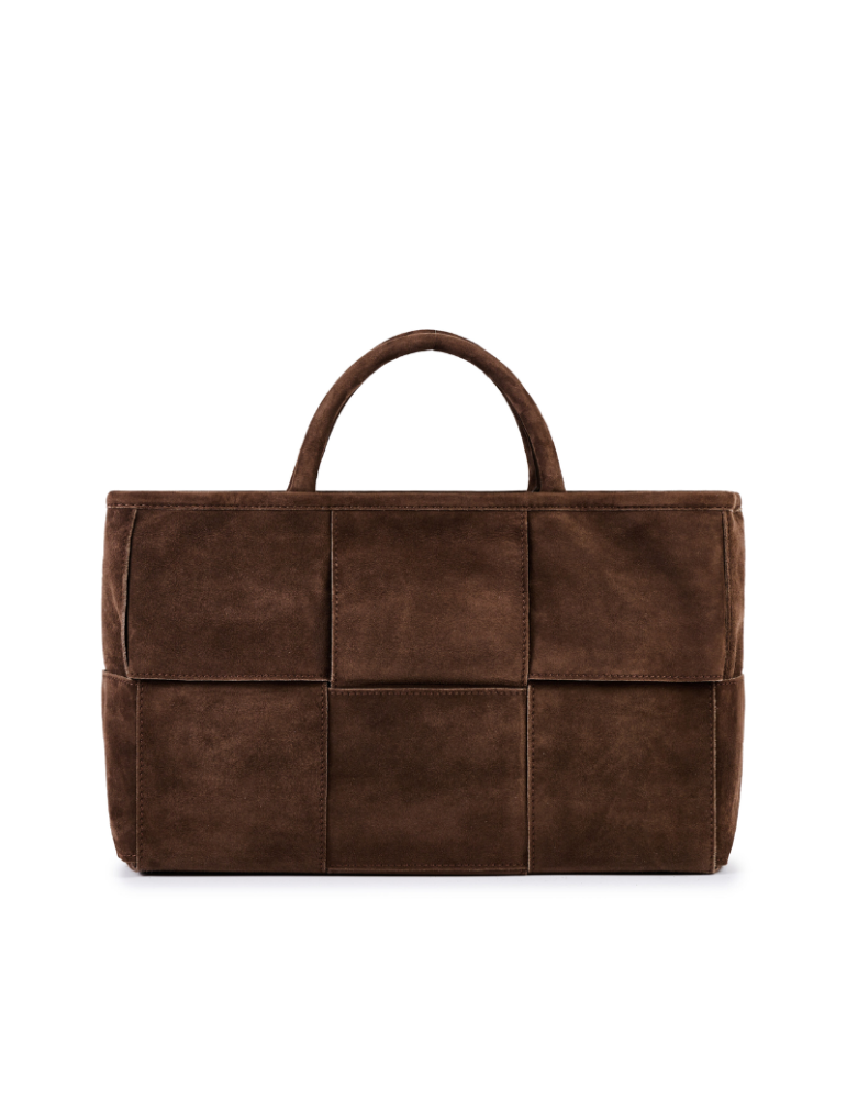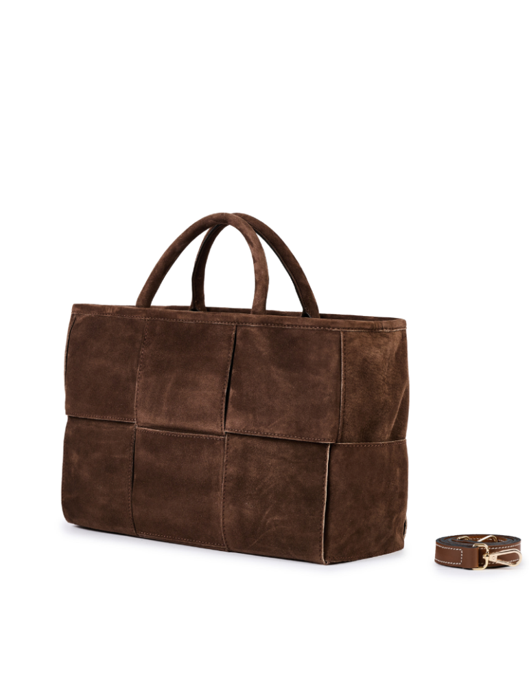Borsa intrecciata in pelle scamosciata, borsa interna in pelle con zip, tasca interna e tracolla in pelle.