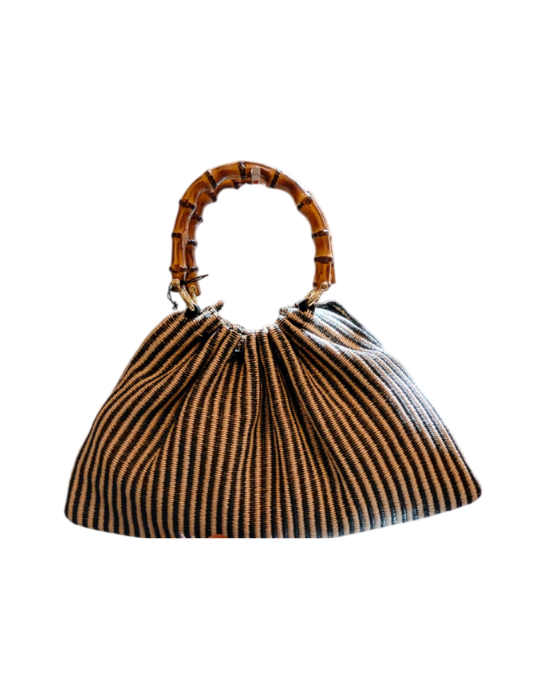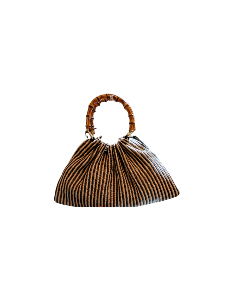 Questa borsa favolosa e morbida è la tua compagna quotidiana perfetta. La sua forma particolare e le maniglie circolari in vero bambù, rappresentano il meglio dell'artigianato e dello stile italiano. Questo prodotto è disponibile anche a strisce arancioni e nere.