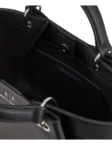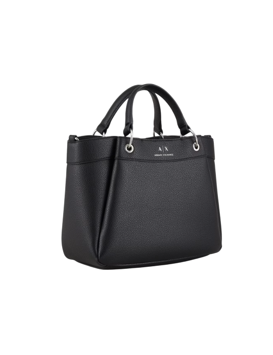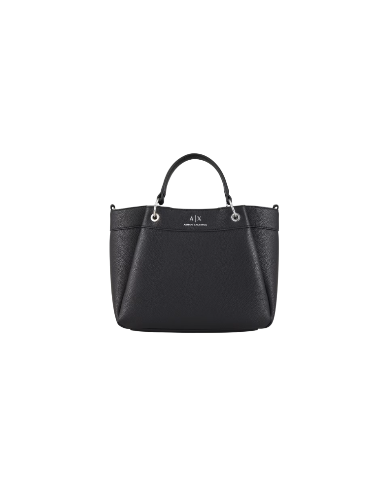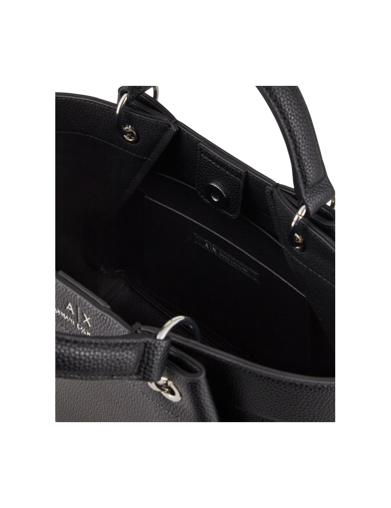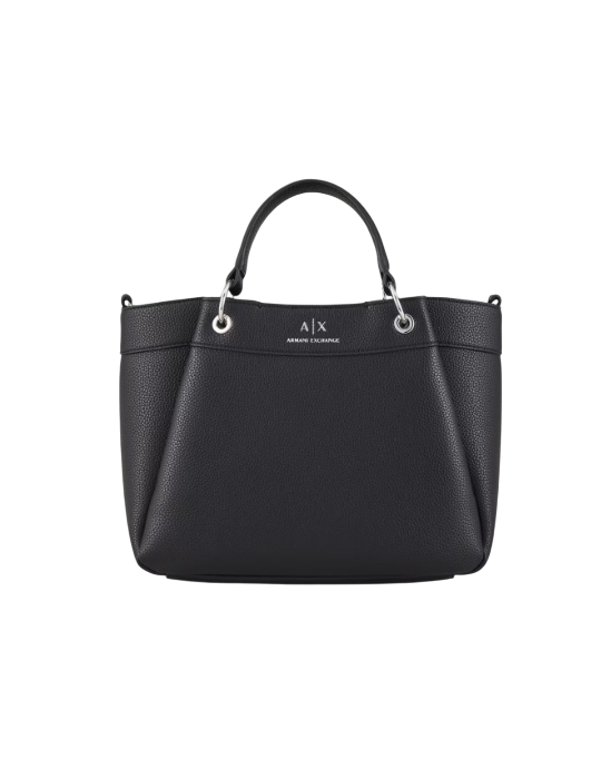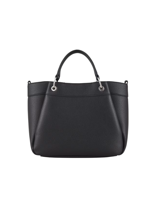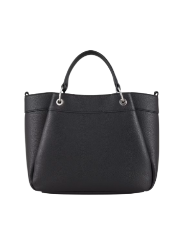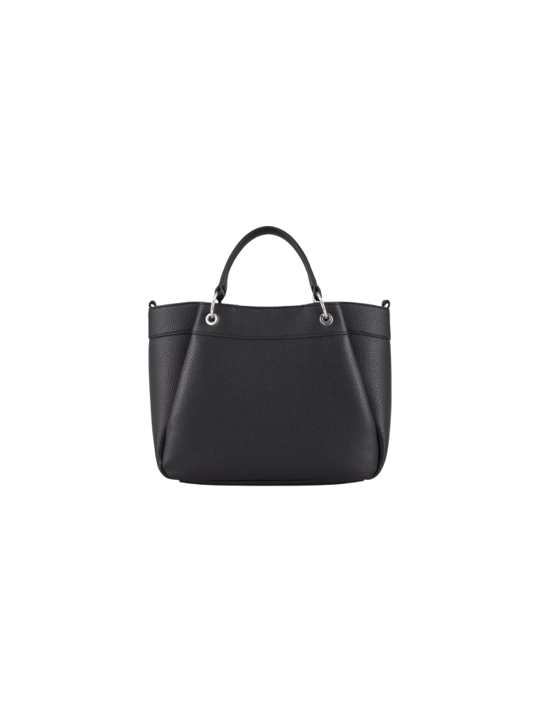Lavorazione a effetto martellato per la borsa shopper media con profilo sagomato, doppi manici e pieghe frontali. Una borsa pratica e stilosisssima, personalizzata dalla scritta logo e dalla tracolla a contrasto logata.