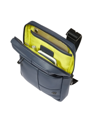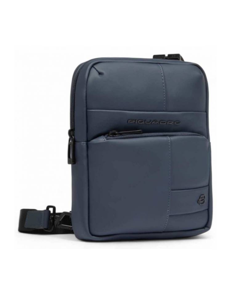 Borsello uomo Piquadro in tessuto antiacqua blu con ampio spazio interno per iPad mini e per organizzare i tuoi oggetti. Tracolla regolabile.