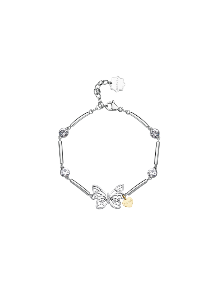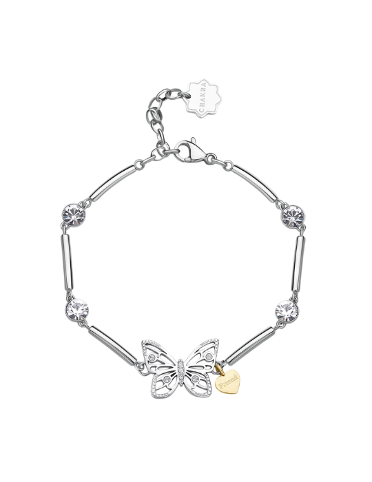 Bracciale semirigido in acciaio 316L con centrale a forma di farfalla, pendente a forma di cuore con finitura pvd oro 14K e incisione "Friend" e cristalli.