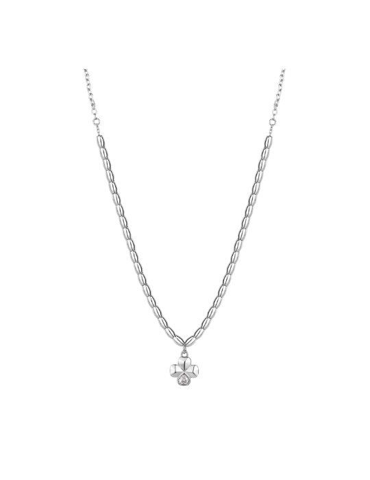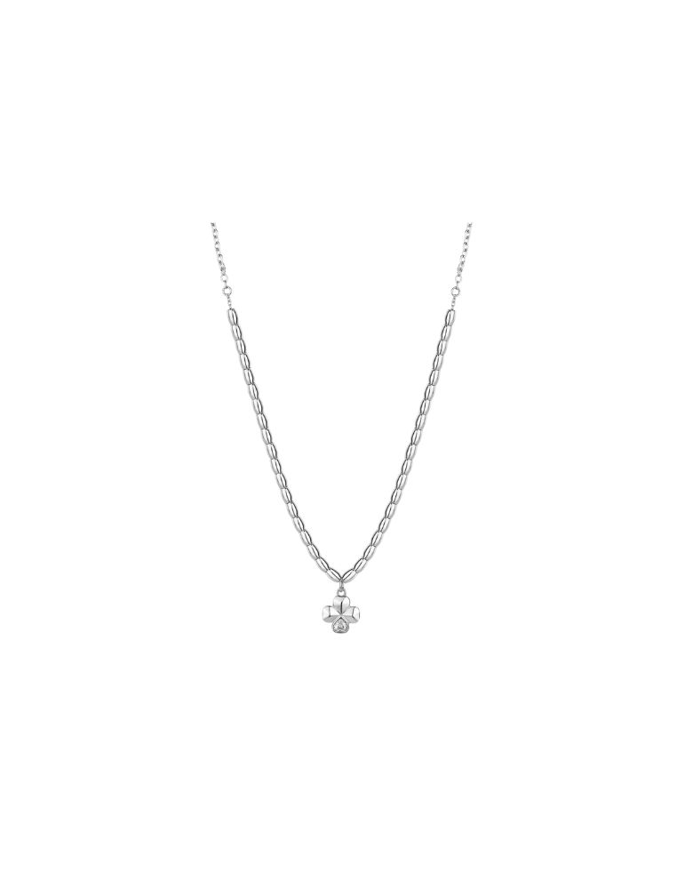 Collana girocollo con sfere in acciaio 316L e pendente a forma di quadrifoglio con cubic zirconia.