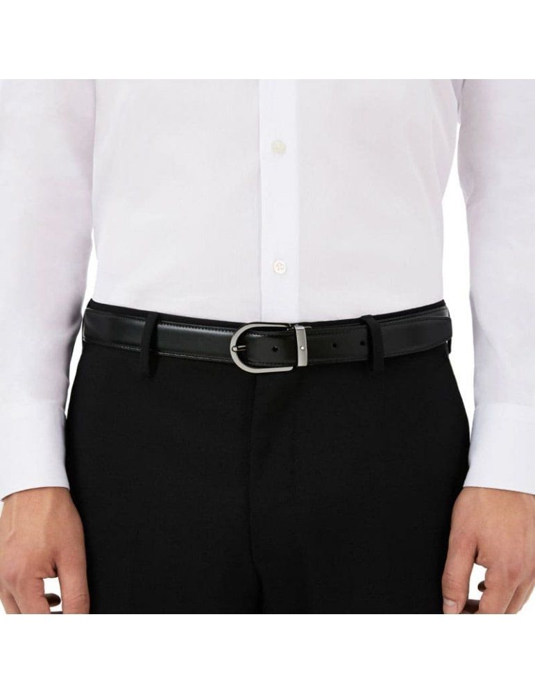 Fibbia a ferro di cavallo finitura rutenio lucido. Cinghia auto-regolabile, 3 cm x 120 cm, reversibile in pelle nera e marrone. Pensata per un look classico con un tocco in più.
