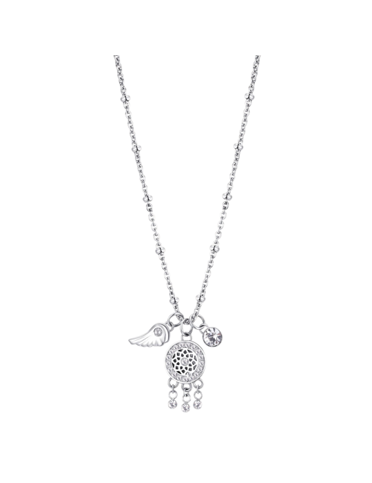 Collana girocollo in acciaio 316L con pendenti a forma di acchiappasogni, ala e cristalli.