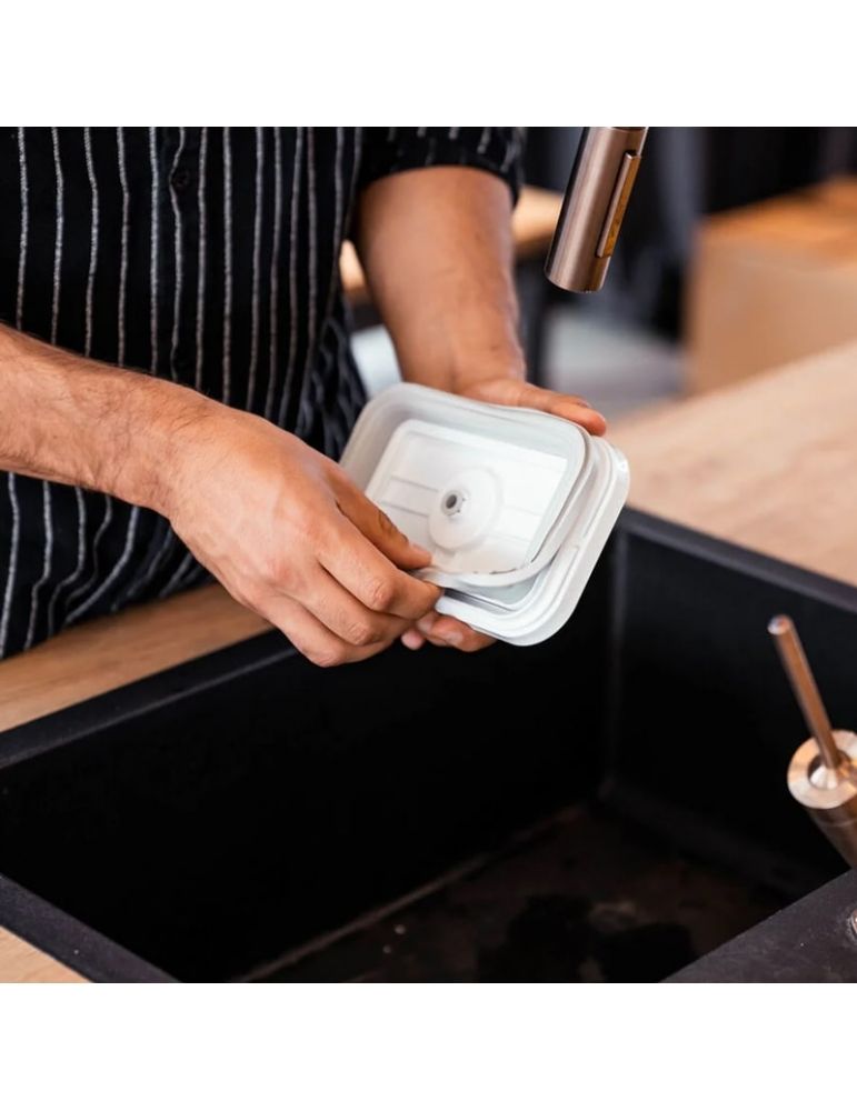 - Coperchio sottovuoto con tecnologia innovativa a doppia chiusura e funzione di indicazione del vuoto: se il coperchio interno viene abbassato, la scatola è sotto vuoto