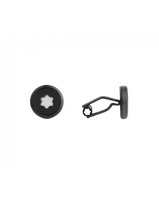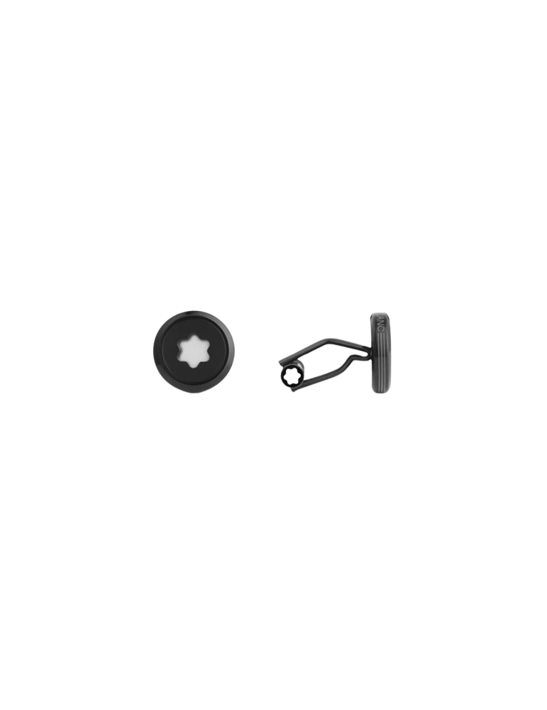 Gemelli in acciaio pregiato con finitura PVD nera. L’emblema Montblanc è rivestito in lacca foto-luminescente.