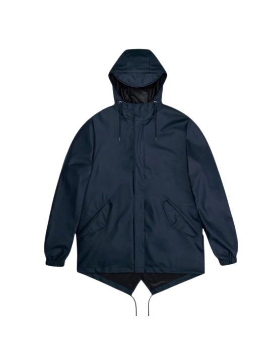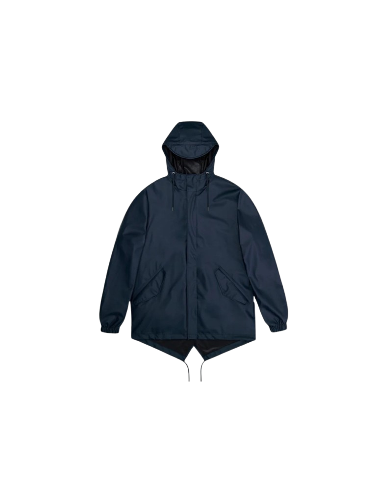 Il Fishtail Jacket è un impermeabile unisex. È caratterizzato da un'estetica essenziale e dall'orlo a coda di pesce con coulisse.