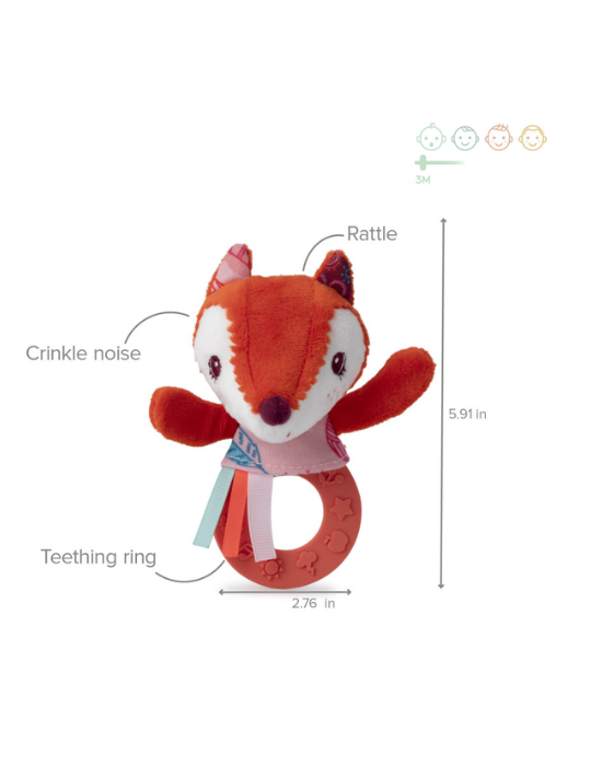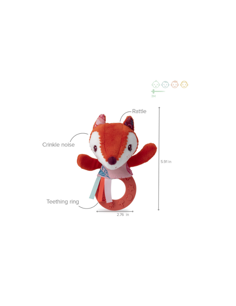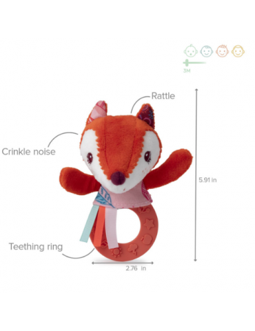 Morbido e confortevole sonaglino a forma di Alice la volpe. Aggiunge un livello extra di stimolazione sensoria emettendo dei sottili suoni di 'campana' e 'carta'