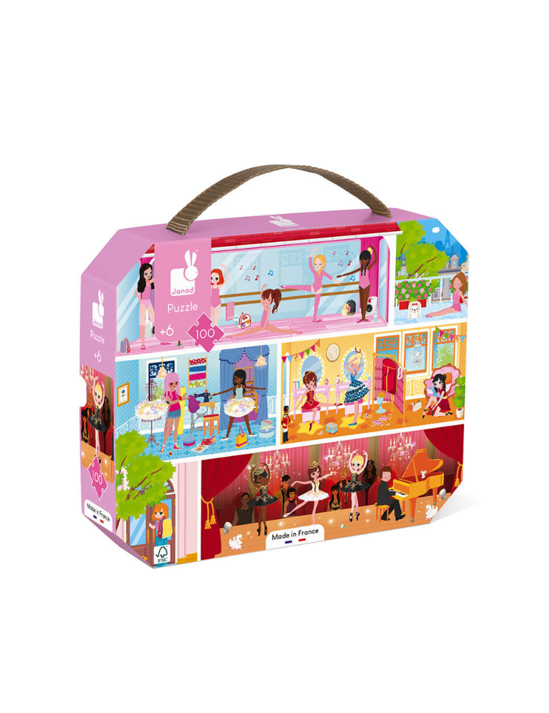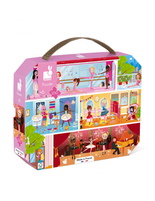 Benvenuti all'accademia di danza! Le magnifiche illustrazioni attraggono i bambini dai 5 anni in su. Una volta terminato, il puzzle misura 50 x 40 cm. Grazie alla simpatica valigetta rotonda con impugnatura in tessuto, il puzzle in cartone è facile da trasportare ovunque. È incluso un poster che serve da modello. Numero di pezzi: 100. Fabbricato in Francia. I materiali forestali utilizzati nella composizione di questo prodotto sono mix FSC®.