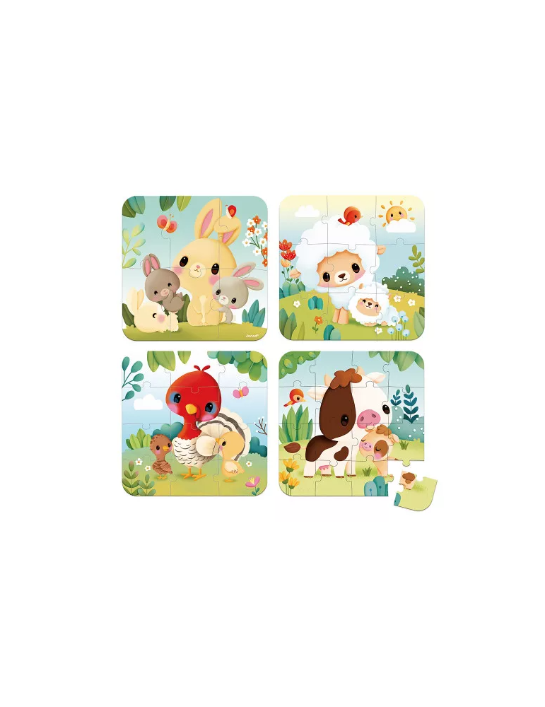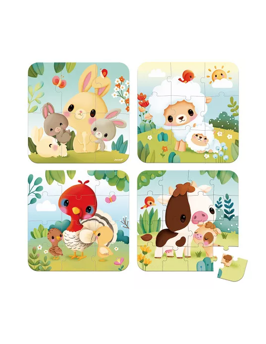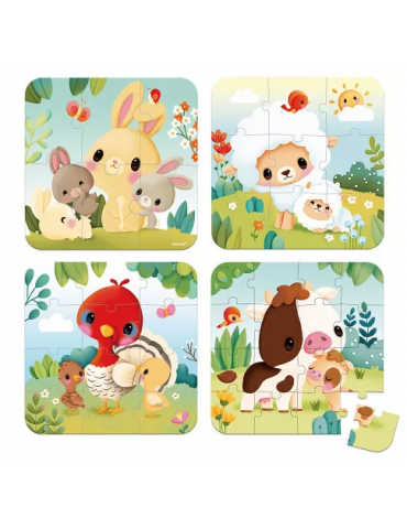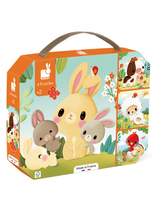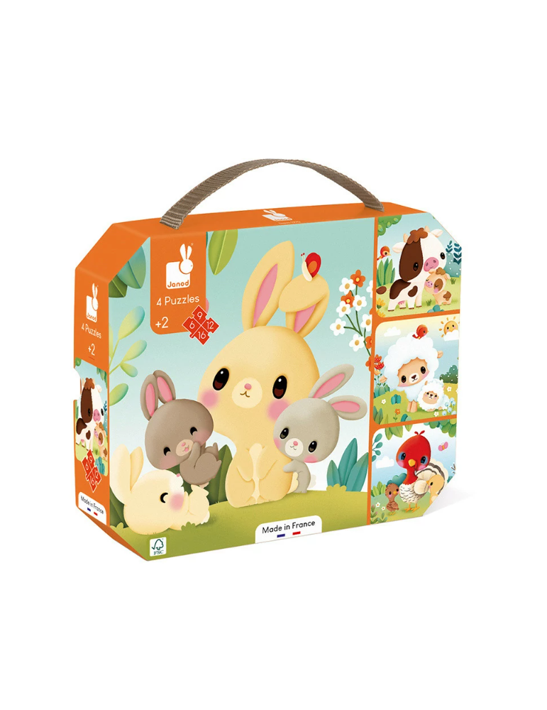 Fai una visita in fattoria! Con questo set di 4 puzzle evolutivi e le loro adorabili illustrazioni, i bambini dai 2 anni in su amplieranno il proprio vocabolario e svilupperanno logica e abilità motorie. La particolarità di questi 4 puzzle in cartone è il numero di pezzi: aumentano progressivamente da 6 a 16! In questo modo, il bambino scoprirà l'attività poco alla volta, familiarizzandosi con gli animali della fattoria. È un ottimo modo per aiutare il bambino a sviluppare le abilità fino-motorie gradualmente, passando da un puzzle da 6 a 9 pezzi, poi da 12 a 16 pezzi: sarà entusiasta di vedere i suoi progressi! Per facilitare l'attività affinché il bambino possa divertirsi anche da solo, può aiutarsi con i colori sul retro di ogni puzzle per ricostruirli. Gli animali della fattoria sono perfetti per stimolare tutti i sensi del bambino! Le tenere illustrazioni dai colori vivaci aiuteranno il bambino a imparare i nomi degli animali e dei loro cuccioli: un coniglio e i suoi coniglietti, una pecora e il suo agnello, una mucca e il suo vitello, un tacchino e i suoi pulcini... I 4 puzzle possono essere riposti nella pratica valigetta, decorata con le illustrazioni degli animali. I puzzle sono ideali per aiutare i bambini a sviluppare la logica, la concentrazione e la calma. Decorato con magnifiche illustrazioni, questo puzzle per la prima infanzia è uno strumento educativo che aiuta a crescere! I puzzle di questo set sono fabbricati in Francia con cartone certificato FSC™. Sono stampati con inchiostri vegetali. Scopri il mondo della fattoria di Janod