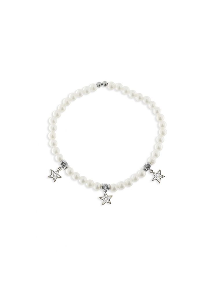 Bracciale elastico perle di conchiglia con tre stelle zirconi bianchi.