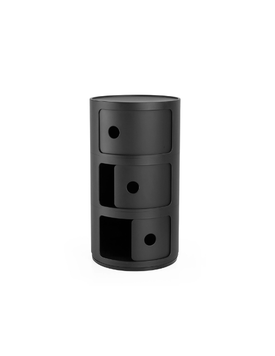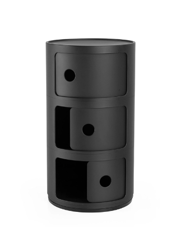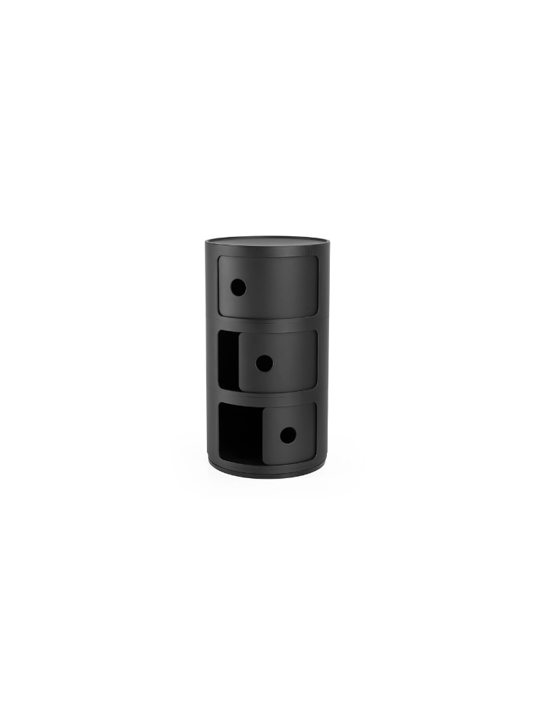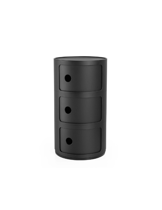 Il Componibile, grande best seller del marchio, disponibile anche nella versione bianca e nera opaca per un’ulteriore veste di uno dei prodotti più famosi e identitari di Kartell che da oltre 50 anni popola le case di tutto il mondo. Oggetto funzionale realizzato in finiture moderne e attuali. La nuova edizione è in materiale riciclato derivante da scarti industriali e conserva le medesime caratteristiche di resistenza e funzionalità della versione originale. Disponibile con struttura fissa non sovrapponibile a due o tre elementi con diamtro da 32cm. Finitura mat effetto soft touch.