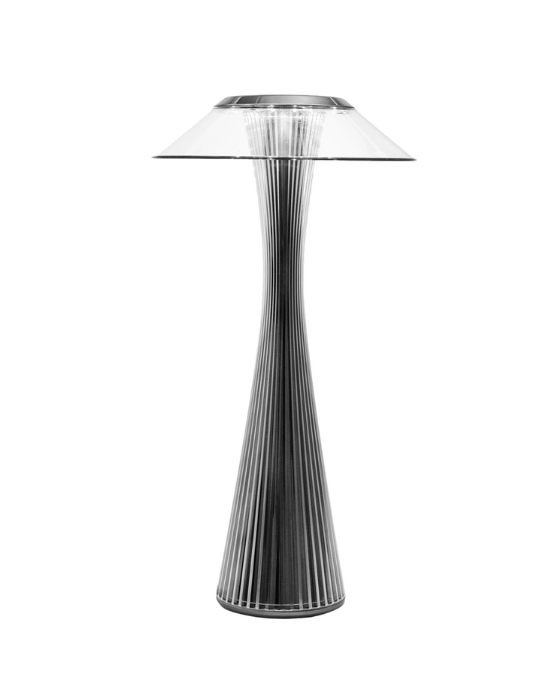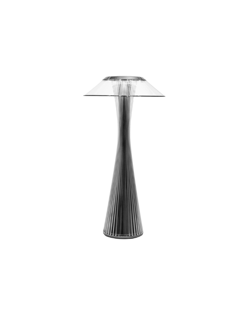 "Lampada da tavolo in materiale plastico trasparente dalla forma allungata: la silhouette richiama le forme dello Space Needle, la torre che ha reso celebre lo skyline di Seattle. “Nel progettare la lampada Space, abbiamo tratto ispirazione dallo spirito futuristico e dalla silhouette iconica del famoso Seattle Space Needle”. Adam Tihany"