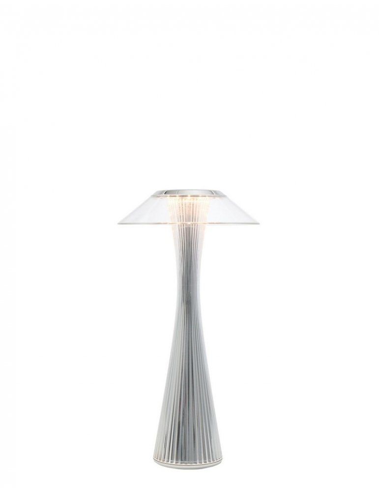 "Lampada da tavolo in materiale plastico trasparente dalla forma allungata: la silhouette richiama le forme dello Space Needle, la torre che ha reso celebre lo skyline di Seattle. “Nel progettare la lampada Space, abbiamo tratto ispirazione dallo spirito futuristico e dalla silhouette iconica del famoso Seattle Space Needle”. Adam Tihany"