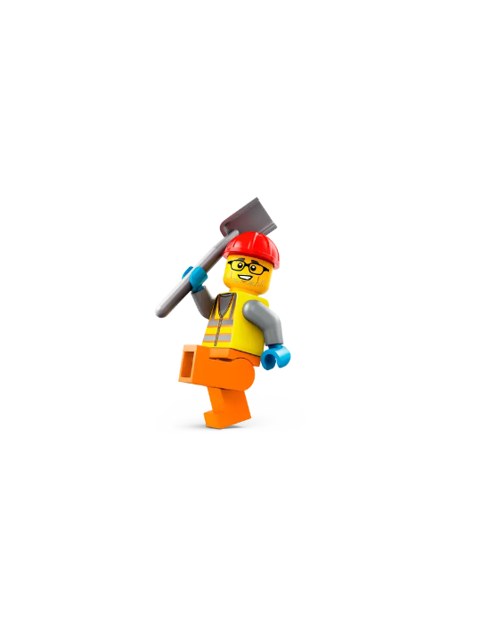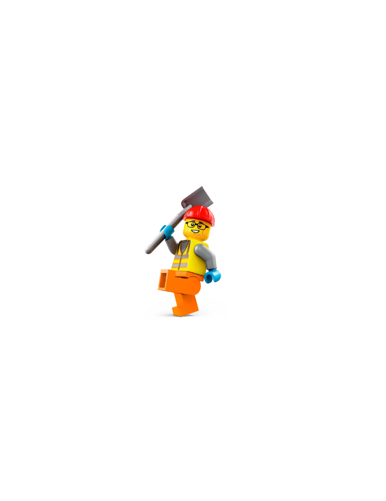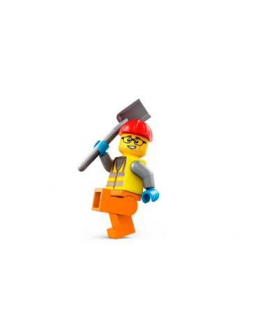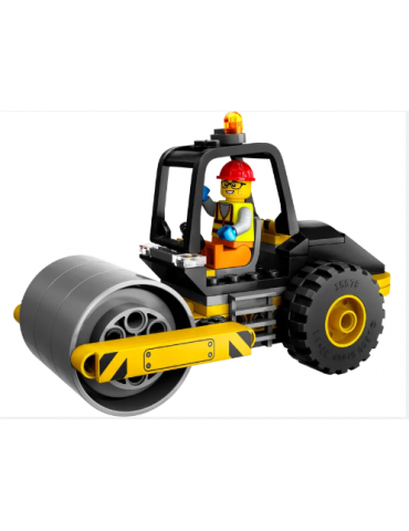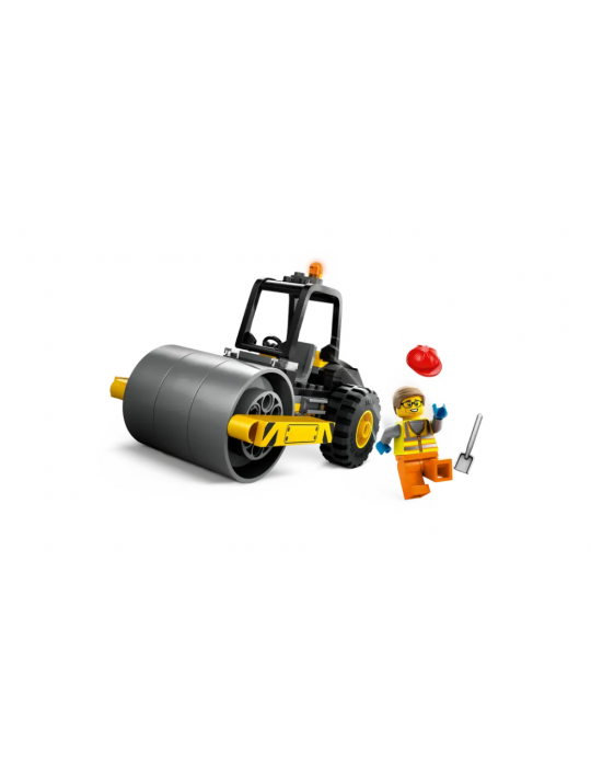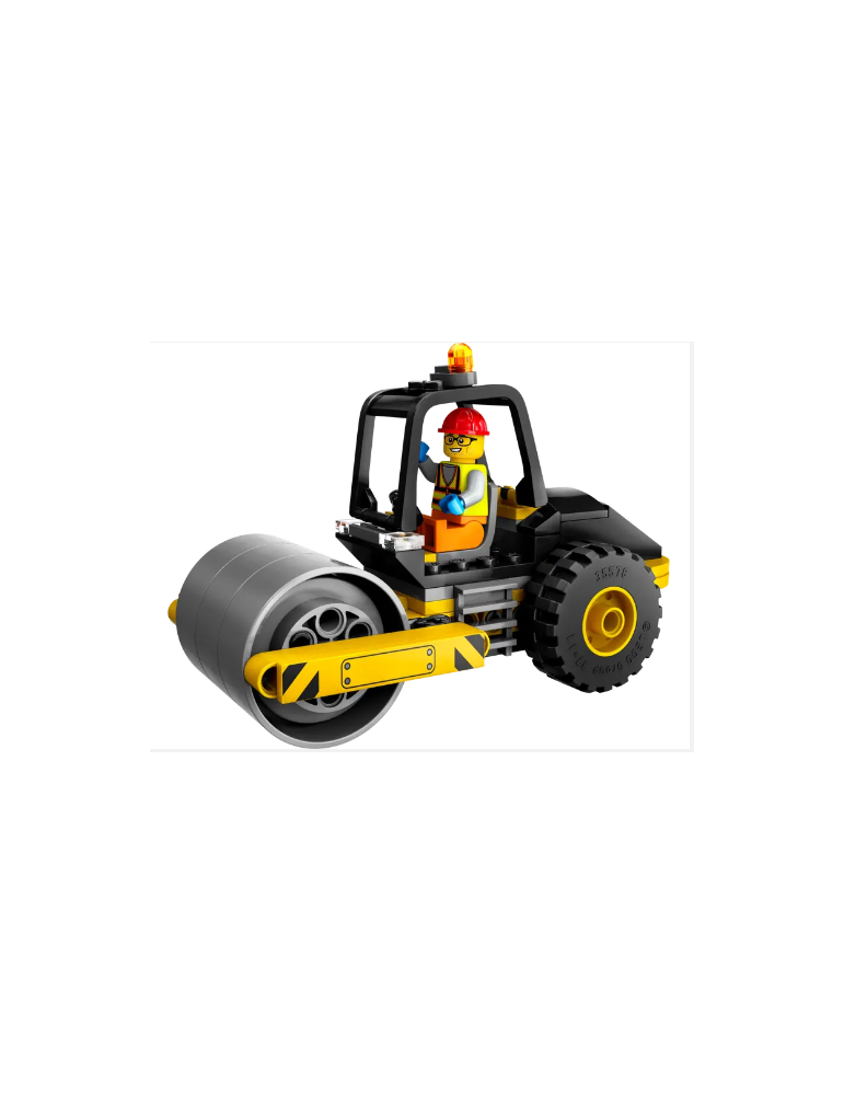 - Compreso di rullo compressore con cabina di guida e faro e una minifigure di operaio edile con casco e pala.