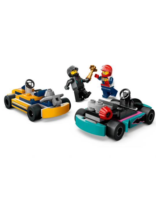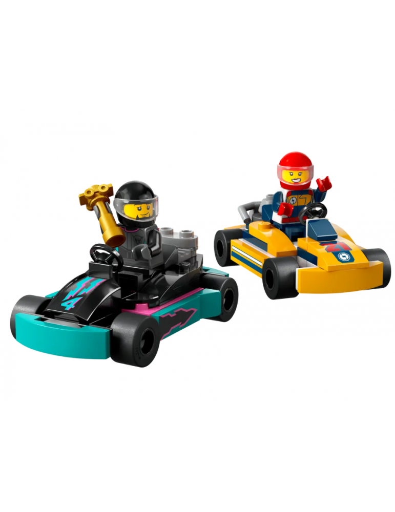 Cosa c’è in questo set da gioco? Tutto ciò di cui i bambini hanno bisogno per costruire un go-kart turchese e uno arancione, più 2 minifigure di pilota e un elemento trofeo