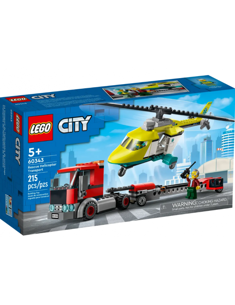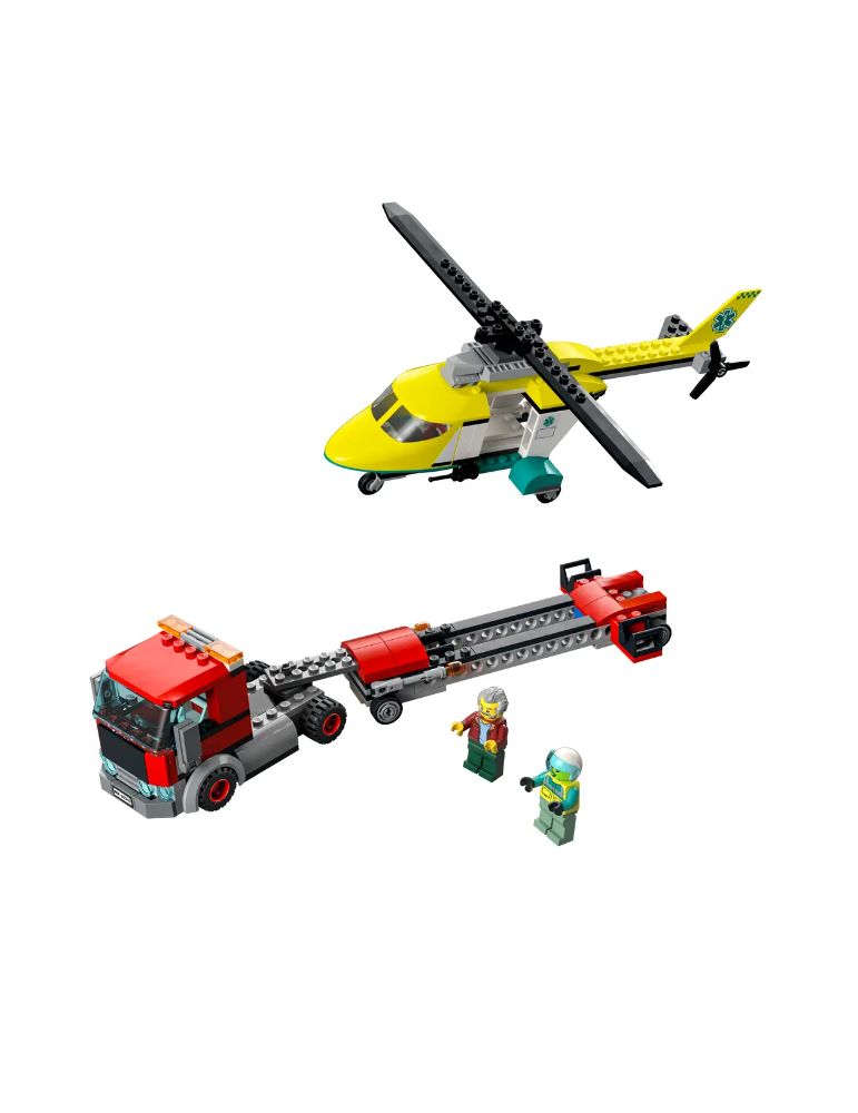 Questo playset Trasportatore di elicotteri di salvataggio LEGO® City è caratterizzato da un classico camion rosso con rimorchio con pianale articolato e luci di segnalazione pieghevoli, oltre a un elicottero di salvataggio giocattolo. Basta aggiungere le minifigure dell'autista e del pilota e un tocco di immaginazione per trascorre ore di gioco ricco di azione.