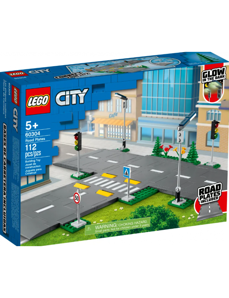 Cosa c’è nella scatola? I bambini troveranno 5 Piattaforme stradali LEGO® con segnaletica orizzontale, dossi e strisce pedonali, oltre a lampioni che si illuminano al buio, semafori giocattolo, cartelli stradali, alberi e vegetazione.