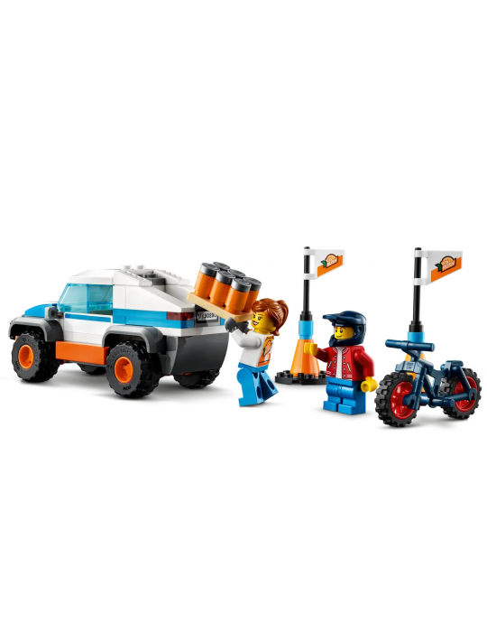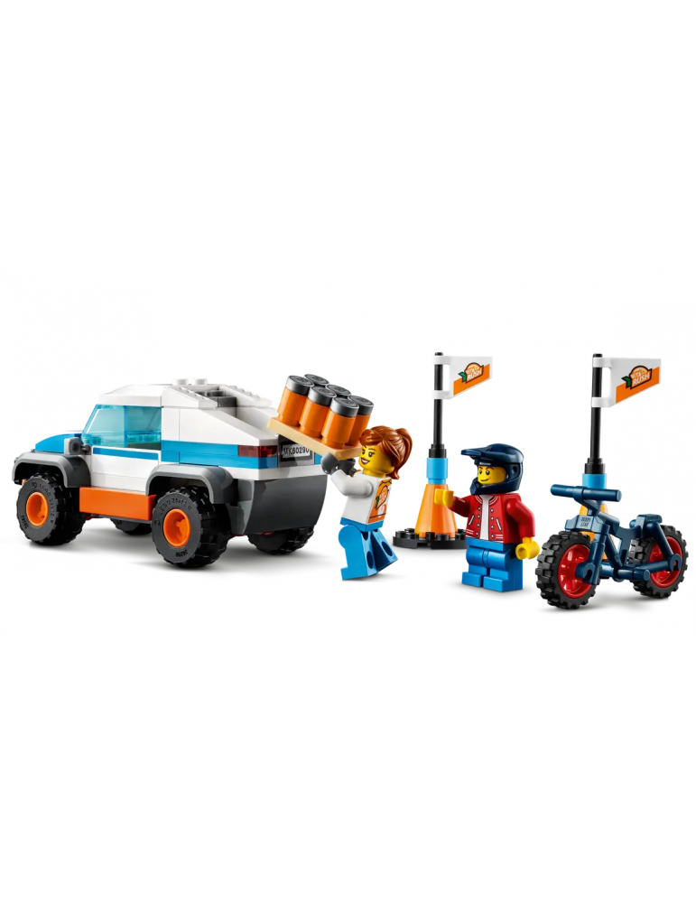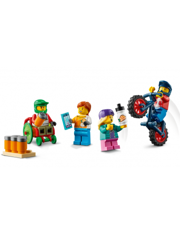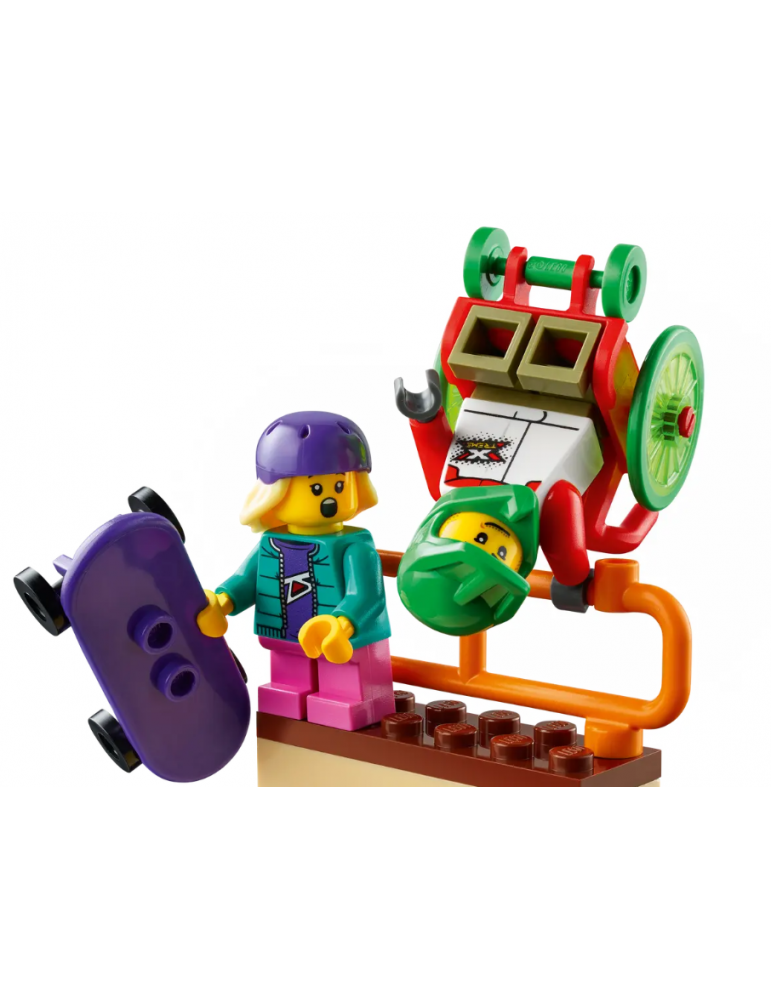 Cosa c’è nella scatola? Tutti i bambini possono creare uno skate park pop-up, che include una piattaforma stradale LEGO®, barriere, bandiere, rampe, un’altalena, più un camion e un pilota di BMX, atleta su sedia a rotelle e minifigure di skater.