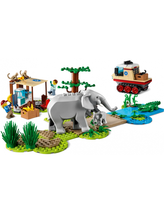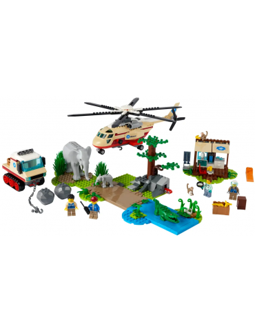 Include tutto il necessario per costruire un elicottero di soccorso, un veicolo cingolato, una stazione veterinaria, un’ambientazione della savana con funzione frana, oltre a un elefante e il suo cucciolo, un serpente, 2 scimmie e 4 minifigure.