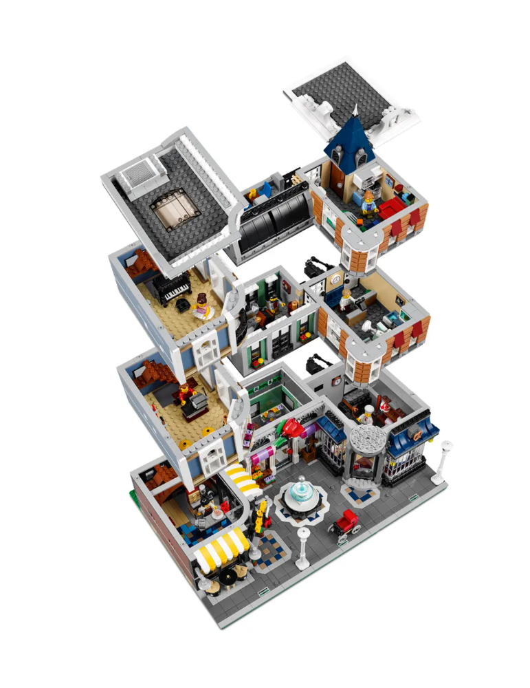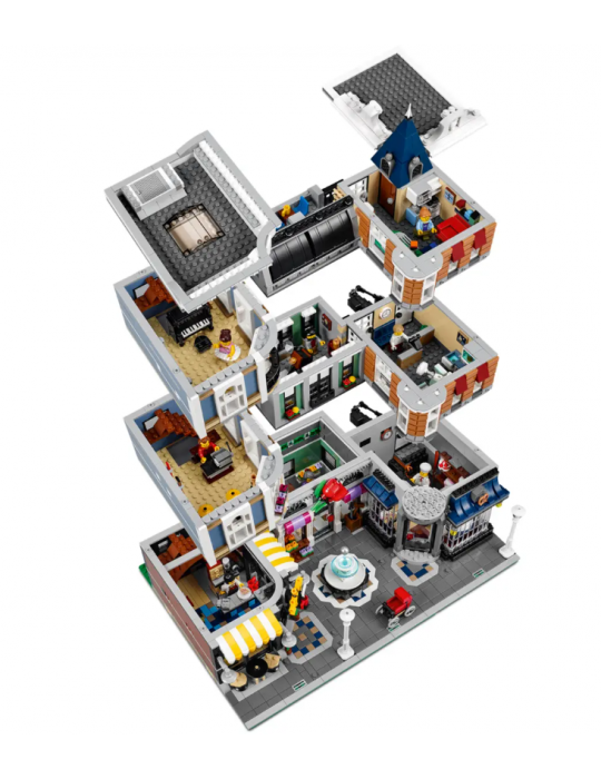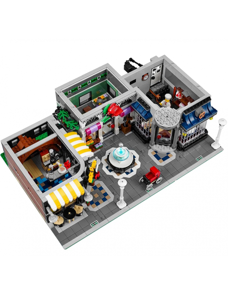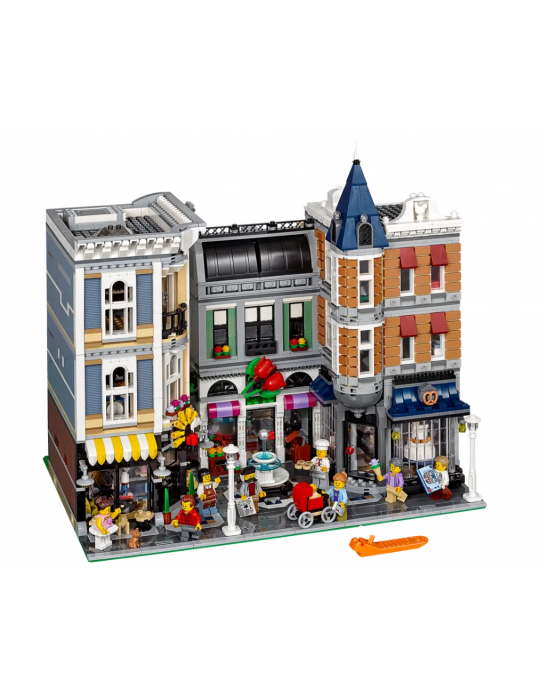 Visita la splendida Piazza dell’Assemblea, sviluppata in occasione dei dieci anni degli edifici modulari LEGO®, e dotata di tantissimi originali e intricati dettagli e sorprese nascoste. Le sezioni dell’edificio, facili da rimuovere, consentono di accedere all’interno dettagliato, composto da piano terra con panetteria, fioraio e caffetteria, secondo livello con negozio di musica, studio fotografico e studio dentistico, e al terzo piano uno studio di danza e un appartamento con accesso a una terrazza panoramica con barbecue. L’esterno dell’edificio è dotato di marciapiede dettagliato con tavoli e sedie della caffetteria, fontana, lampioni e una facciata altamente elaborata con bellissime finestre e porte dettagliate, tre insegne costruibili, torre con guglie e linea del tetto ornata. Include otto minifigure e un bebè.