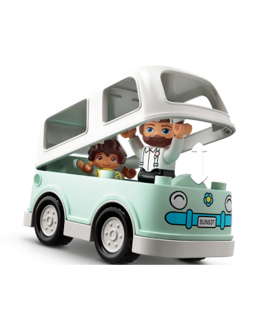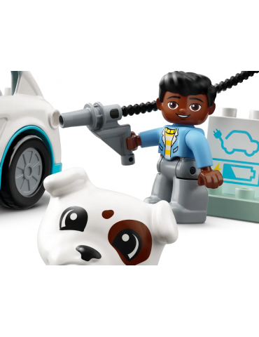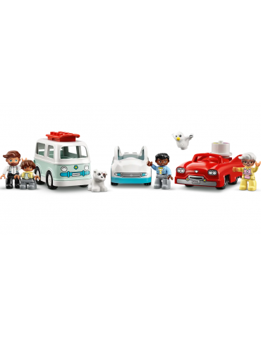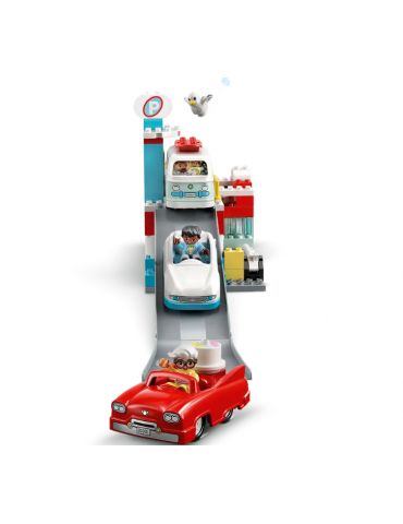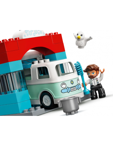 Include 4 personaggi DUPLO® , 2 uomini, una nonna, un bambino e un cane, divertenti caratteristiche, come l’autolavaggio drive-through con tenda di "pulizia" in tessuto, una barriera mobile e una biglietteria automatica.