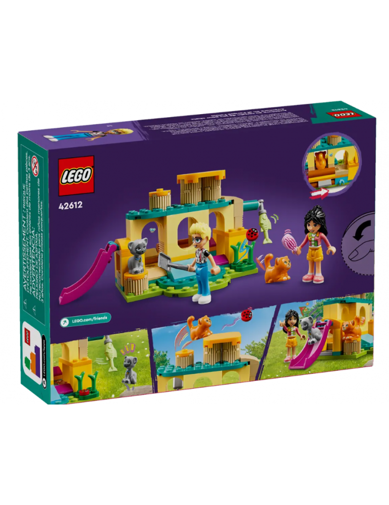 Gli amanti dei gatti potranno divertirsi un mondo con il set Avventure nel parco giochi dei gatti LEGO® Friends per i bambini e le bambine dai 5 anni in su che adorano gli animali giocattolo. Il set include un parco giochi costruibile, 2 mini-doll, 2 animali e accessori per la cura degli animali che includono un pesce giocattolo, una pianta di erba gatta, cibo e una lettiera.