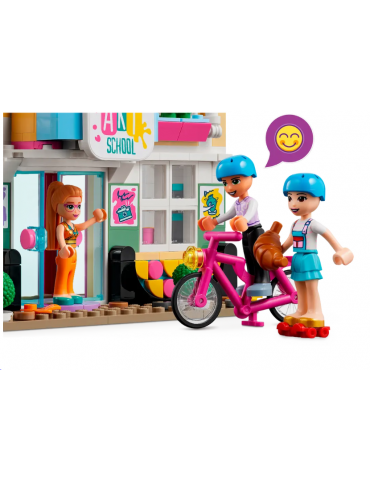 Cosa c’è nella scatola? 844 pezzi per creare un edificio a 3 piani con aule di artigianato, studi d’arte da esplorare e un assortimento colorato di giocattoli artistici e 3 personaggi LEGO® Friends