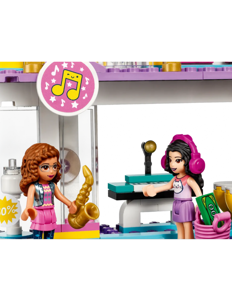 Il set include 5 negozi che riflettono gli interessi generali dei bambini, da cibo e musica a tecnologia e giocattoli ed è fornito con altri 2 elementi di gioco. La cabina fotografica e la piattaforma girevoleper le sfilate sono separate dal modello principale, rendono il gioco più interattivo e sono abbastanza piccole da poter essere trasportate in una borsa per divertirsi con LEGO® a casa di un amico o a scuola.