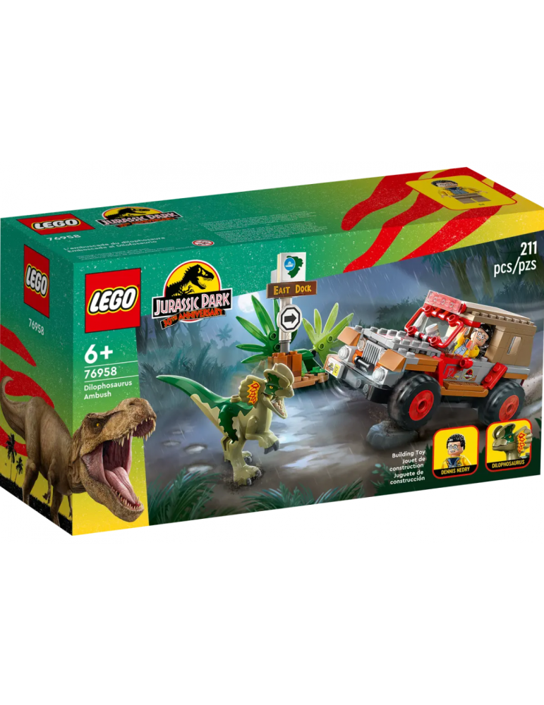 I bambini possono ricreare una scena classica di Jurassic Park e raccontare le loro storie con questo set da costruzione collezionabile L’agguato del Dilofosauro LEGO® Jurassic World. Un regalo fantastico per bambini dai 6 anni in su, contenente un Dilofosauro e una Jeep® di Jurassic Park costruibile con sedile di guida per la minifigure di Dennis Nedry, minifigure infangata e decorazione di impronte di dinosauro. C’è anche un piccolo modello di giungla, con cartello “East Dock” che la Jeep può abbattere come nel film, e un elemento bomboletta Barbasol per ispirare il gioco di fantasia.