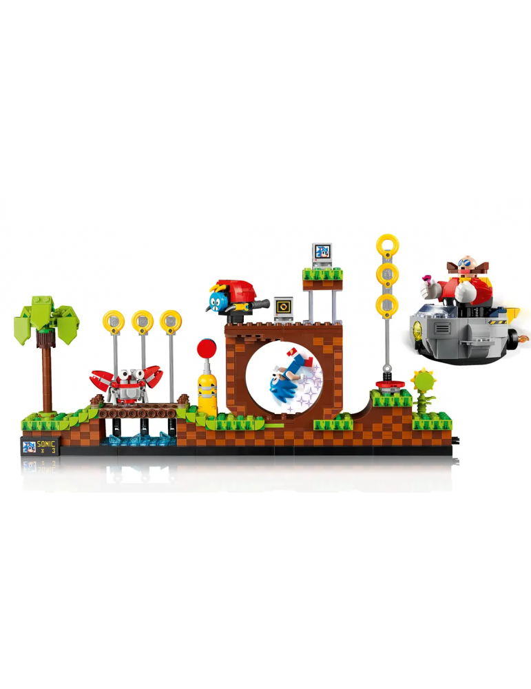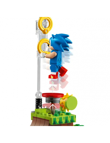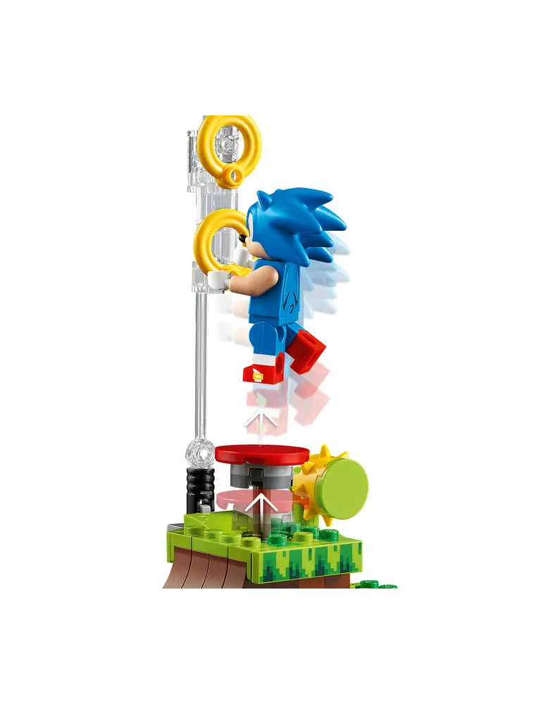 Ostacoli e dettagli autentici: costruisci un albero di palma, il giro della morte e la molla attivata a leva per i Super Sonic Jump, oltre a 7 anelli e 2 TV costruibili con 5 elementi schermo e 5 sticker diversi