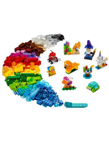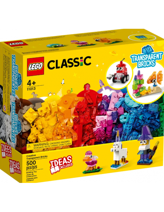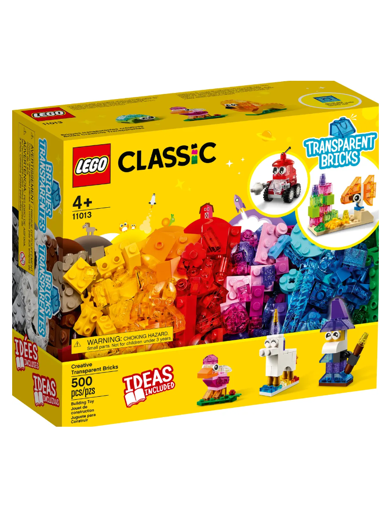 Il set costruibile Mattoncini trasparenti creativi LEGO® Classic (11013) contiene un’incredibile gamma di pezzi LEGO trasparenti in ogni colore, forma e dimensione, oltre a un’entusiasmante selezione di mattoncini, pezzi, occhi e ruote LEGO classici.