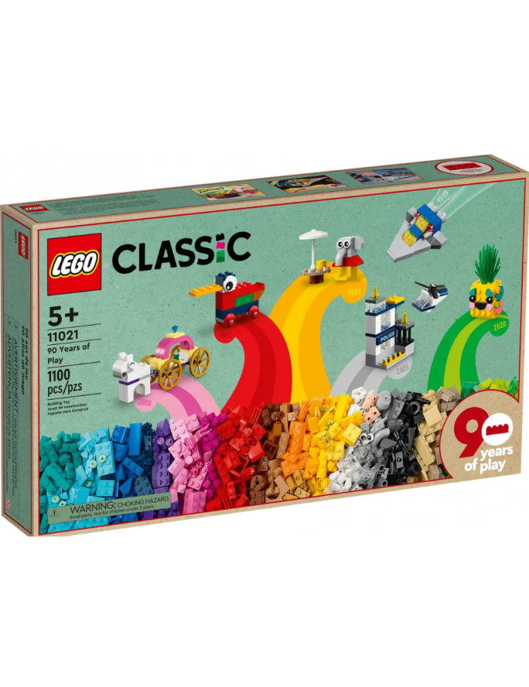 Bambini, adulti e veterani possono trascorrere ore di divertimento carico di nostalgia con il set di costruzione 90 Anni di Gioco LEGO® Classic (11021). Un tributo alla storia dei giocattoli creativi dell’infanzia, questo set è fornito con un arcobaleno di pezzi colorati LEGO, 15 mini riproduzioni di classici giocattoli LEGO divenuti famosi negli anni, oltre a mattoncini extra per la costruzione libera!