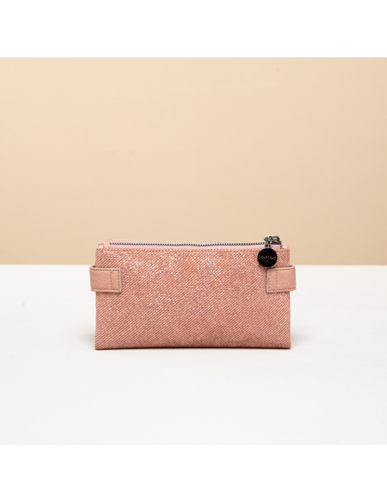 Portafoglio morbido effetto lurex, con comodi scomparti per tessere, carte di credito e monete. Chiusura con zip color argento