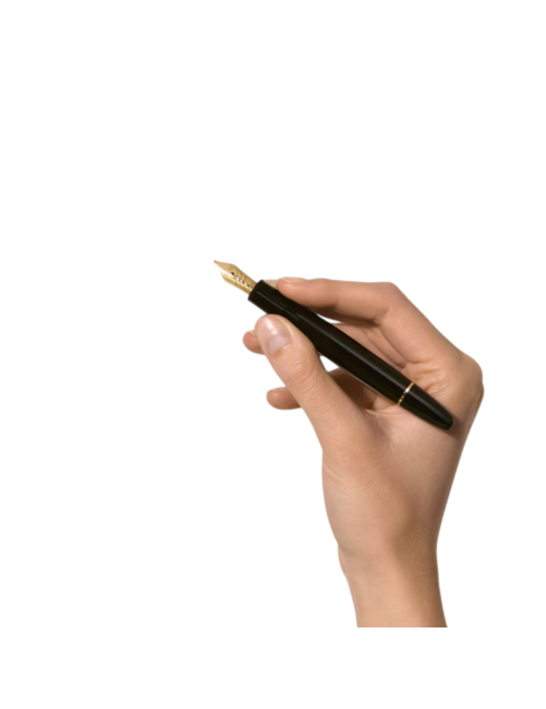 Il corpo e il cappuccio sono realizzati in pregiata resina nera, con l’iconico emblema Montblanc bianco intarsiato nella parte superiore del cappuccio. La stilografica è impreziosita da un innovativo pennino ricurvo in oro massiccio Au750 lavorato a mano e decorata con tre delicate linee parallele, un simbolo ispirato ai movimenti della calligrafia. Il pennino ricurvo consente una varietà di stili di scrittura e di spessore del tratto, a seconda dell’angolo e dell’orientamento con cui viene impugnato lo strumento.