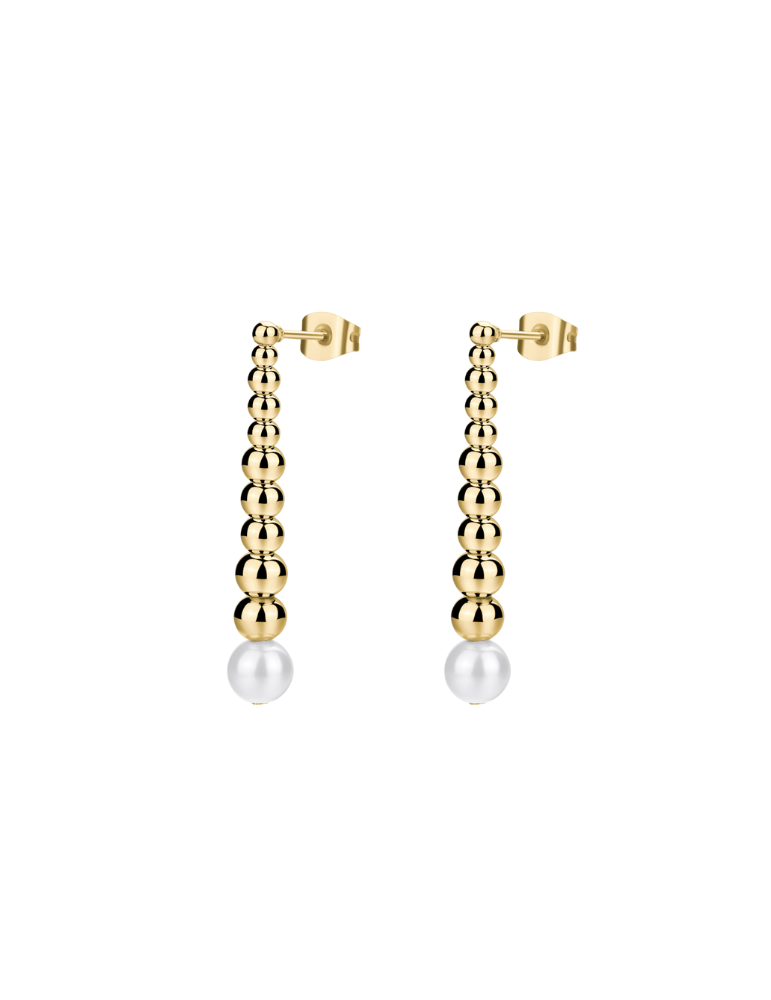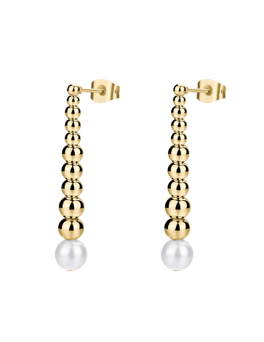 Orecchini pendenti in acciaio 316L e finitura pvd oro 14K, con perla di conchiglia.